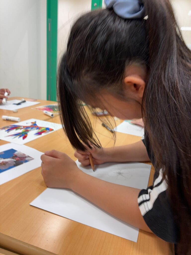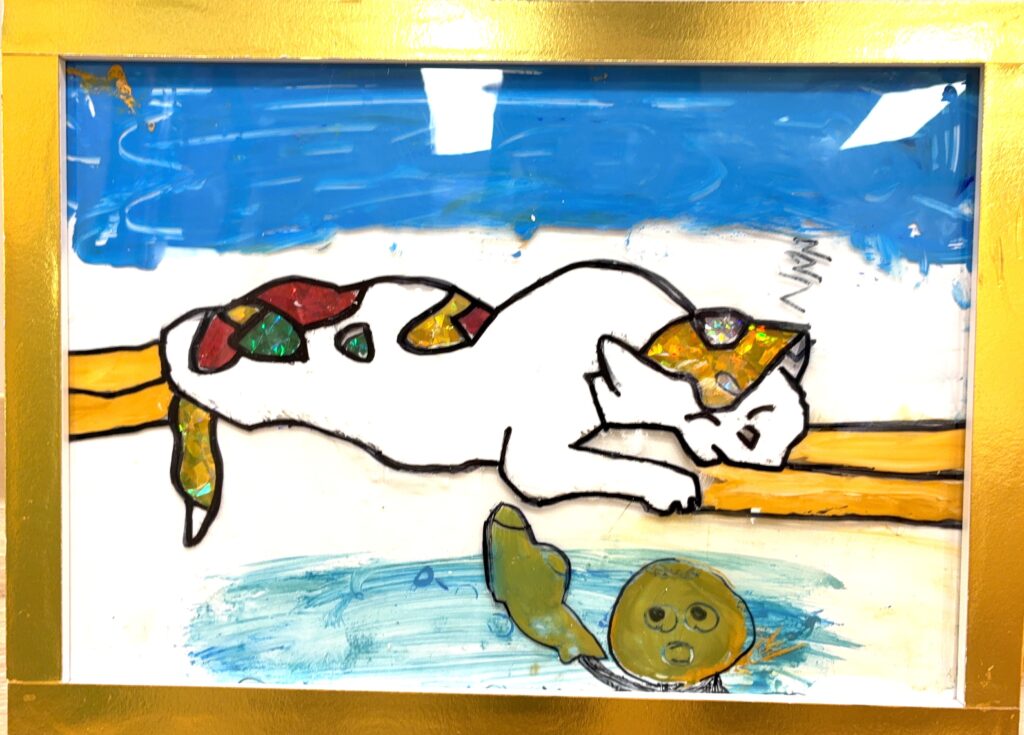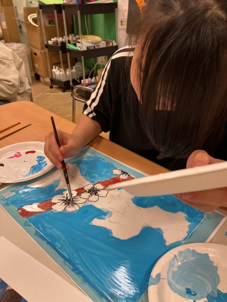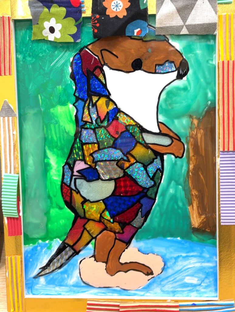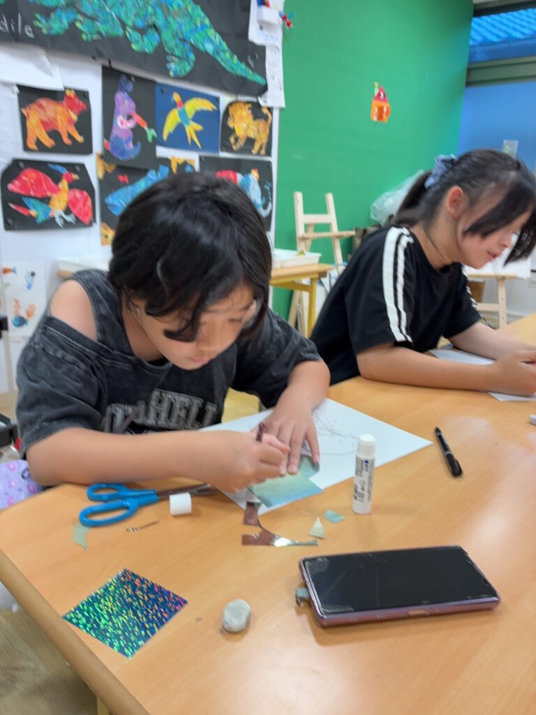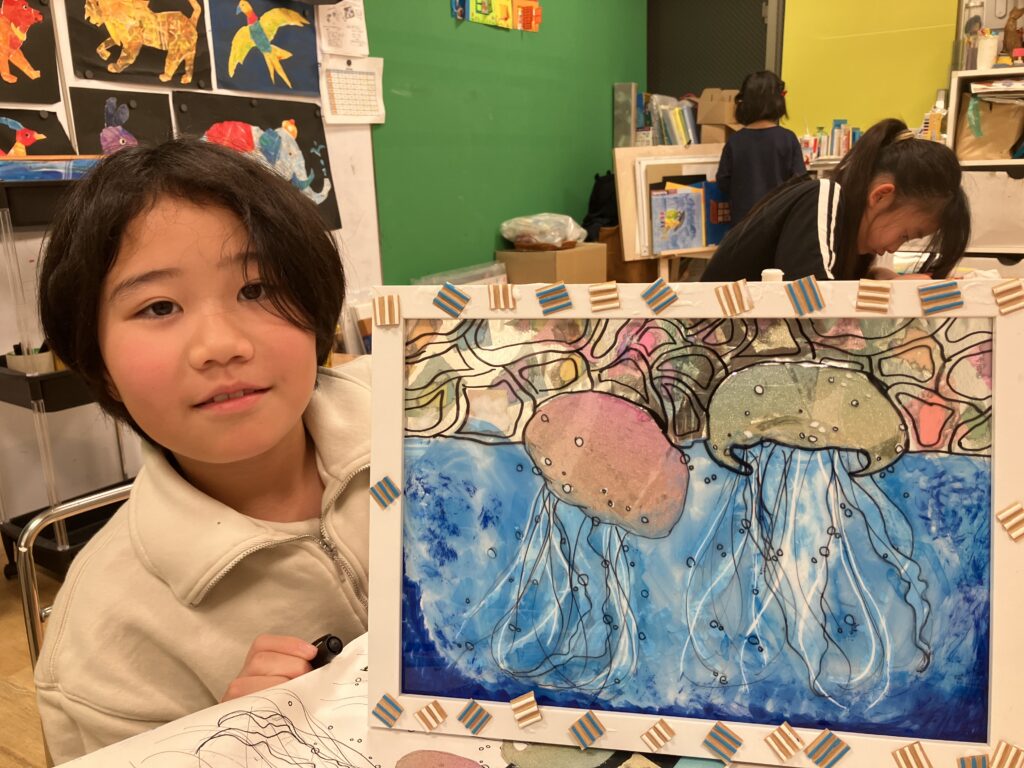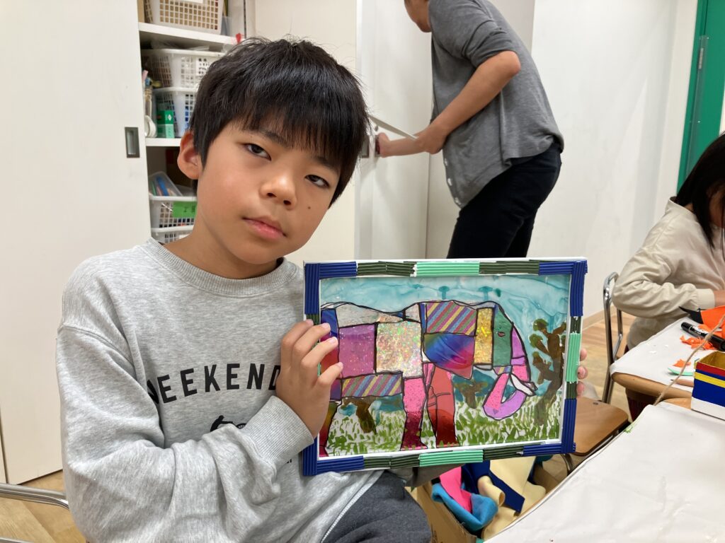 10月の小学生アートクラスは2週かけて「ガラス絵」をステンドグラス調に制作しました。