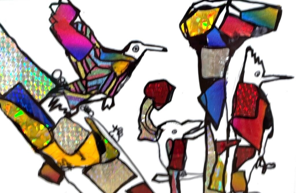下書きが完成したら、キラキラと輝く折り紙を使って、スタンドグラス調にしたい箇所に