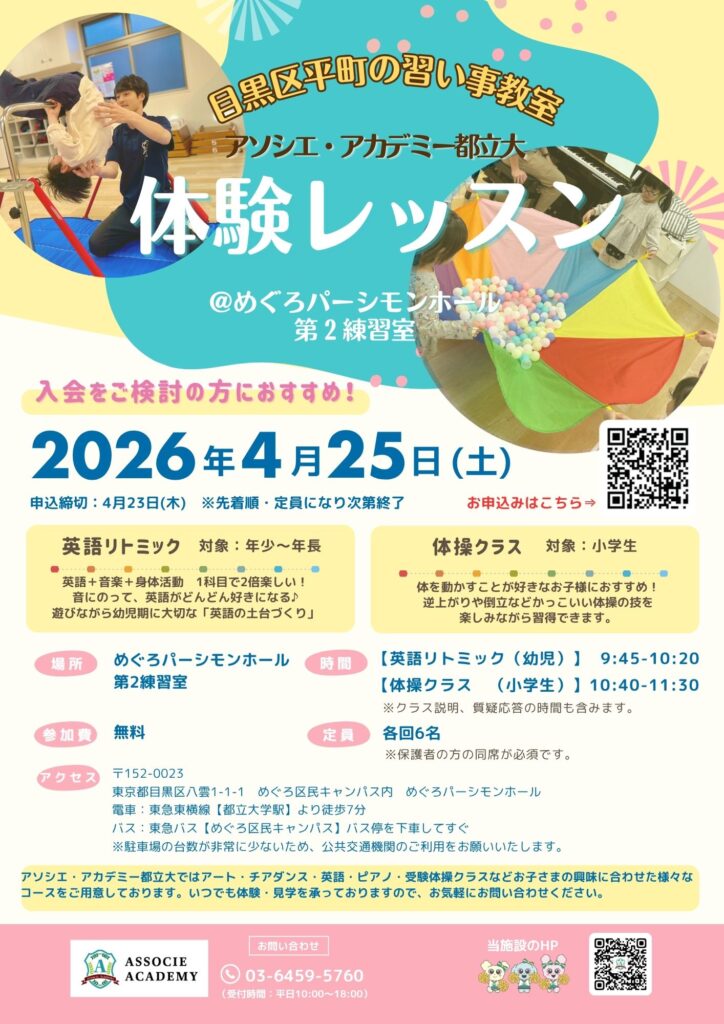 4月25日(土)にめぐろパーシモンホール第2練習室にて小学生向けの体操クラス、幼児向けの英語リトミッククラスの無料体験レッスンを開催します!詳細は下記ポスター、または申込サイト「こくちーず」よりご覧ください。皆様のお越しをお待ちしております。