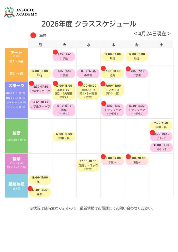 4月24日時点の各クラスの空き状況です。