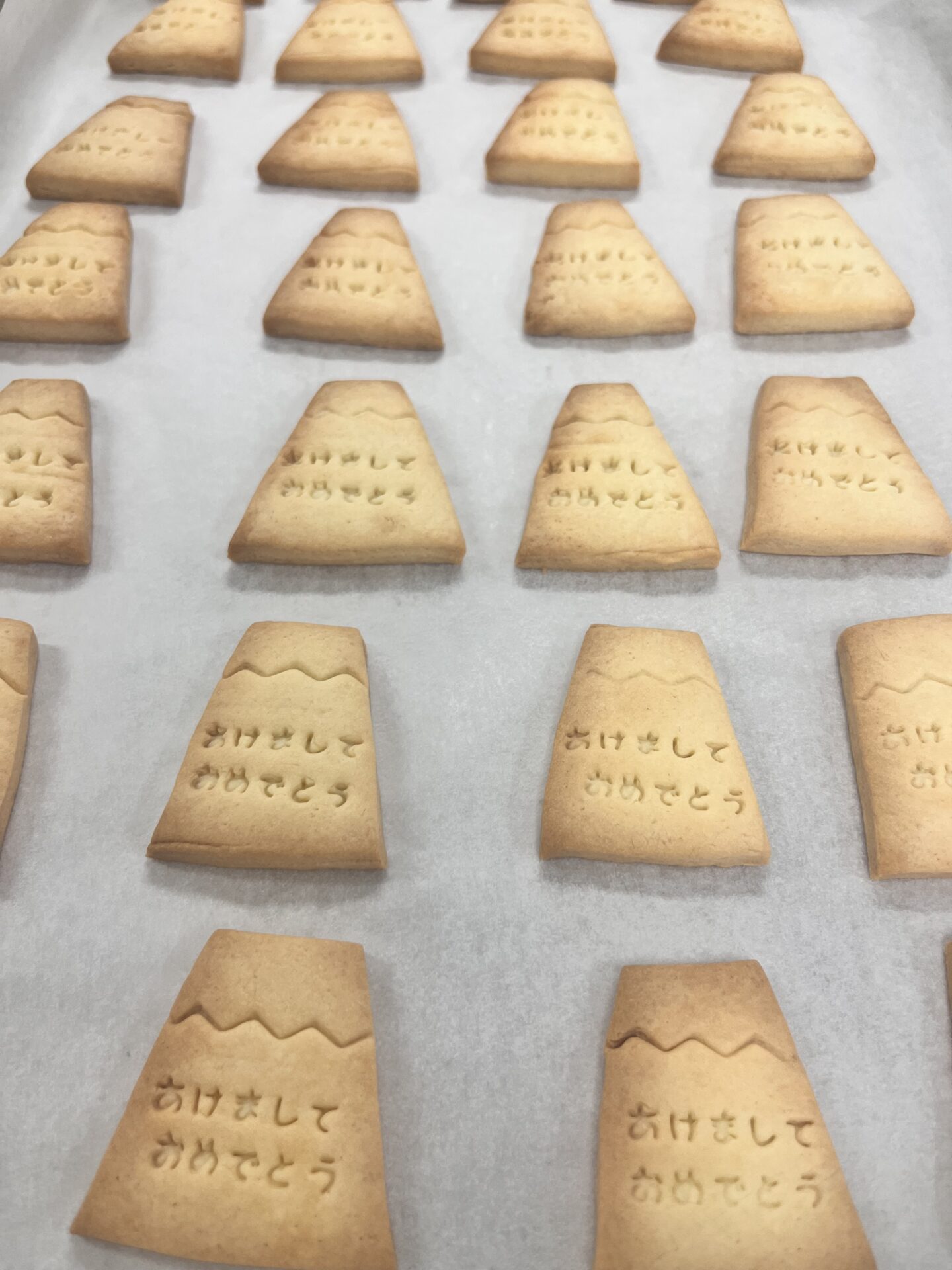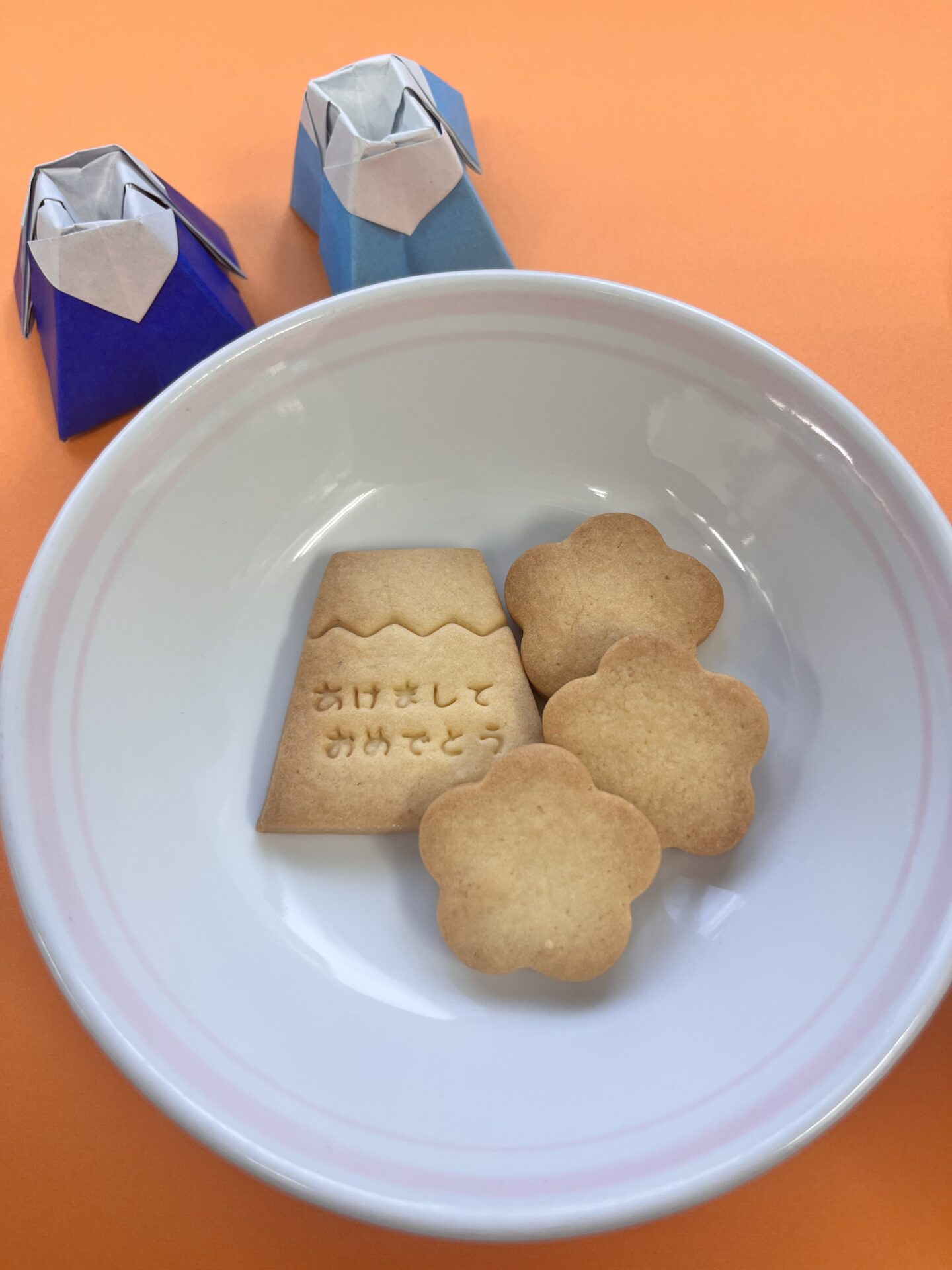 新年のおめでとうと、お誕生日のおめでとうを合わせて、富士山と花型でおめでたいクッキーに仕上げました。