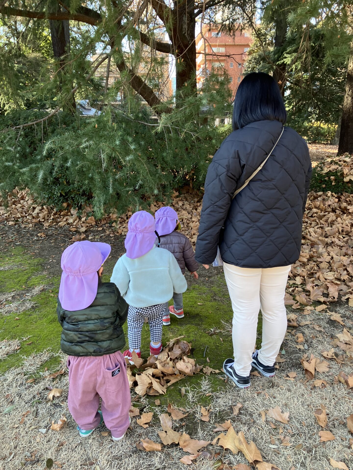 保育者と一緒に落ち葉の方へ。何があるかな?と興味津々な姿も見られます。
