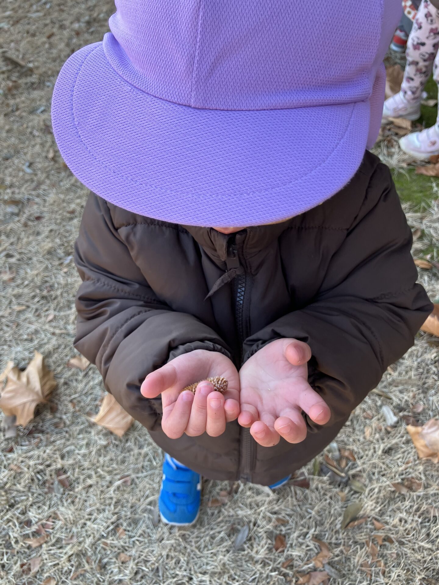 笠の開いていない松ぼっくりを発見!「松ぼっくりの赤ちゃん」と嬉しそうに話す姿が見られました。