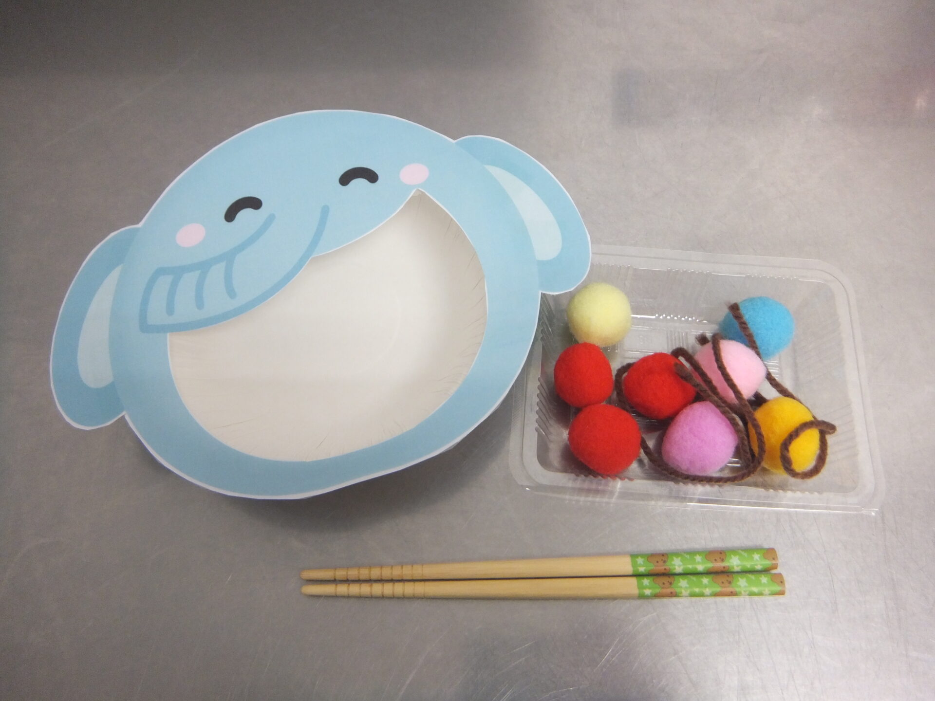 最後はゾウのイラストをつけた紙皿を使ってスポンジをつかんで移動する練習をしました。