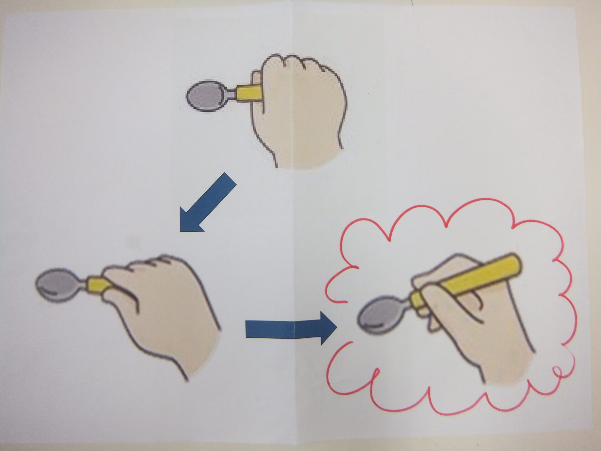 ※写真右下のように逆手持ちができるようになると箸への移行がしやすいと考えられます。