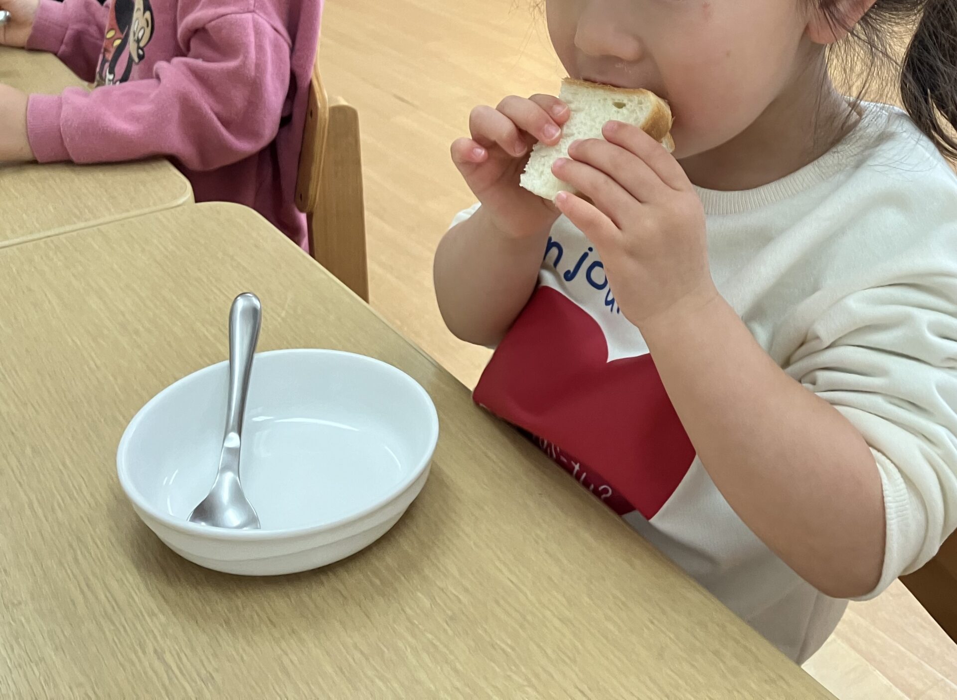 パンを配ると、みんなスプーンで綺麗にジャムを塗っていました。