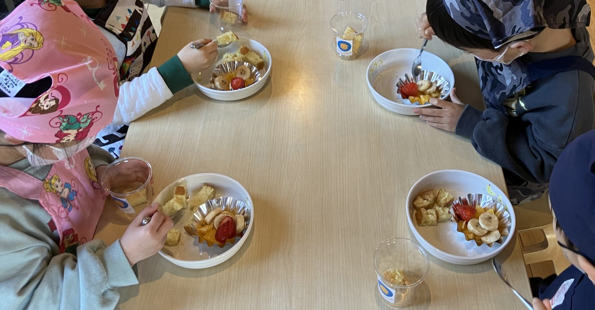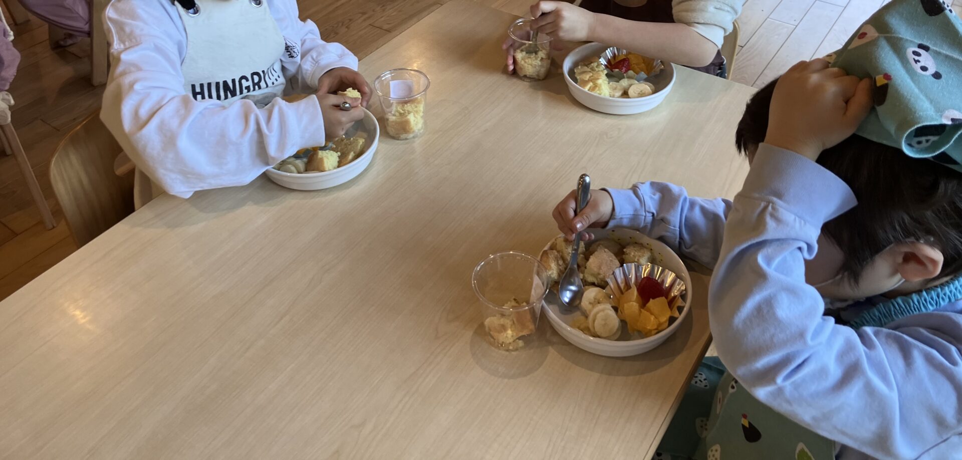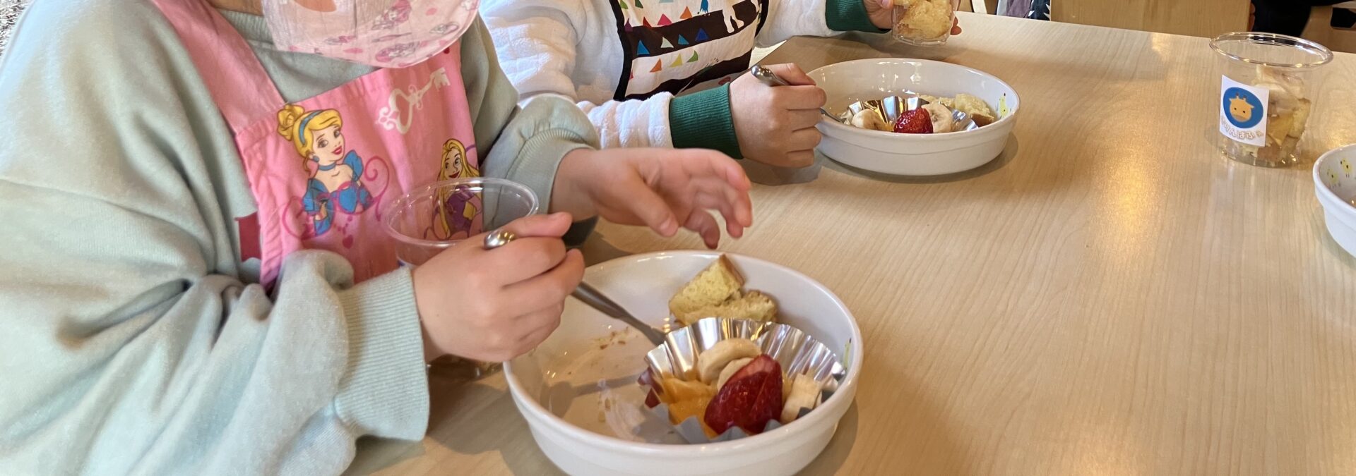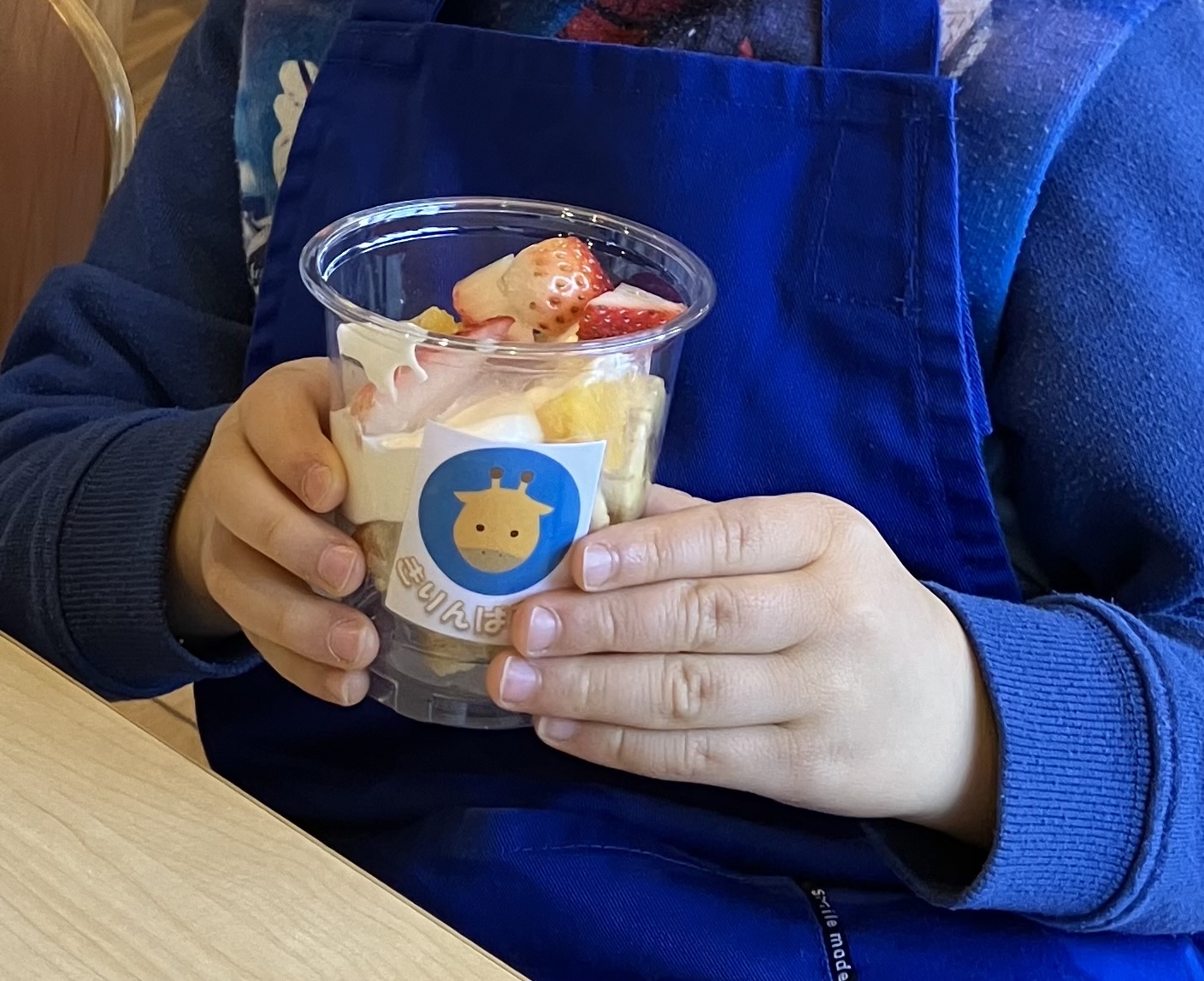 きりん組さんは、栄養士が用意したいろいろな果物を使って自分だけのオリジナルパフェを作ってもらいました!