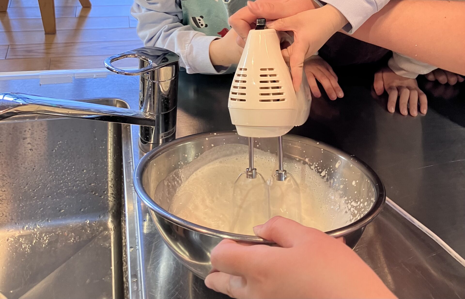 「だんだんクリームみたいになってる!」「すごい!」とだんだんホイップクリームになっていく様子に大興奮でした