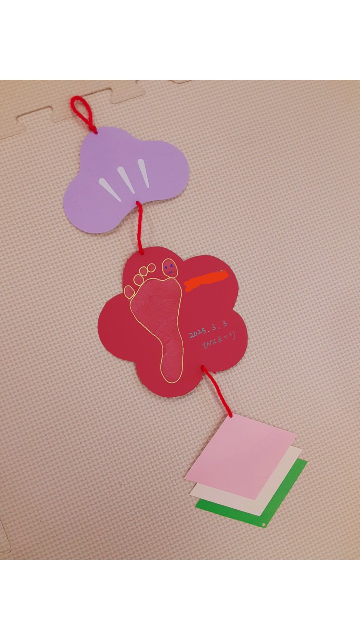 今回の製作では桃の花をかたどった台紙に手形や足形スタンプをして、つるし雛を製作しましたよ🌸