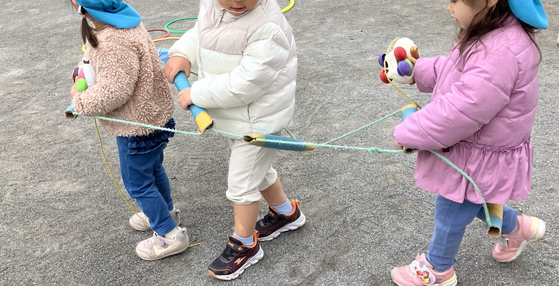 砂遊び玩具やフラフープ/ボール/縄跳び等…、まかな保育園の玩具をお借りすると