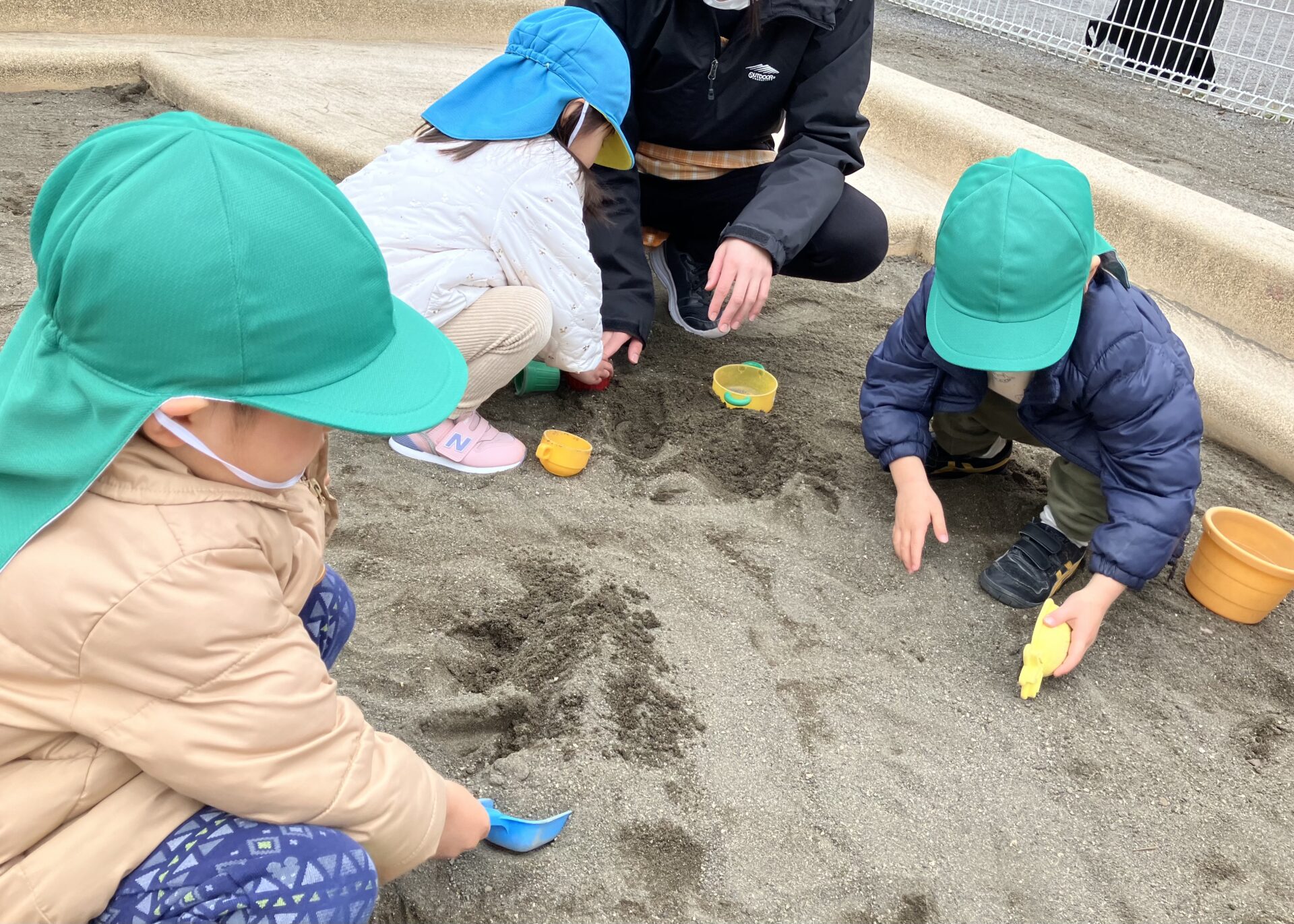 うさぎ組の戸外遊びで大人気の砂遊びでは、たくさんの働く車の玩具やティーカップ等を見つけ、