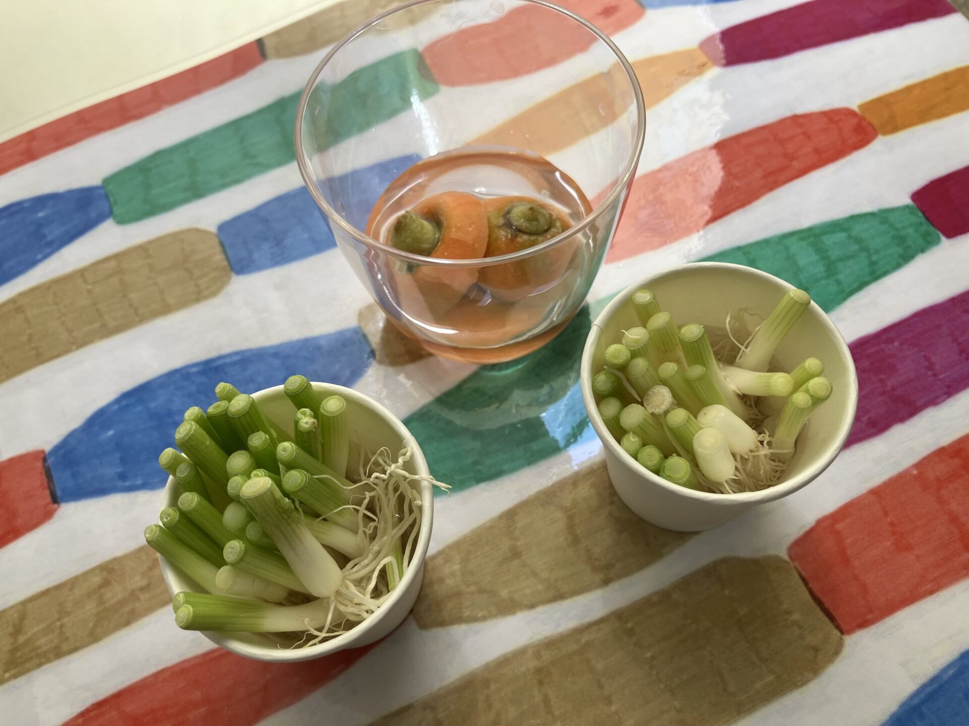 給食で出た切れ端で水耕栽培をしています♪