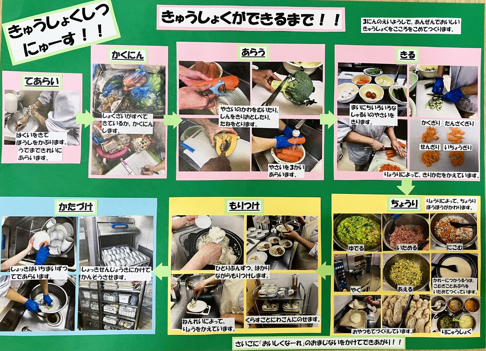 「給食ができるまで」は、普段食べている給食がどのように出来ていて、安全で美味しい食事を心を込めて作っていることを伝えました。