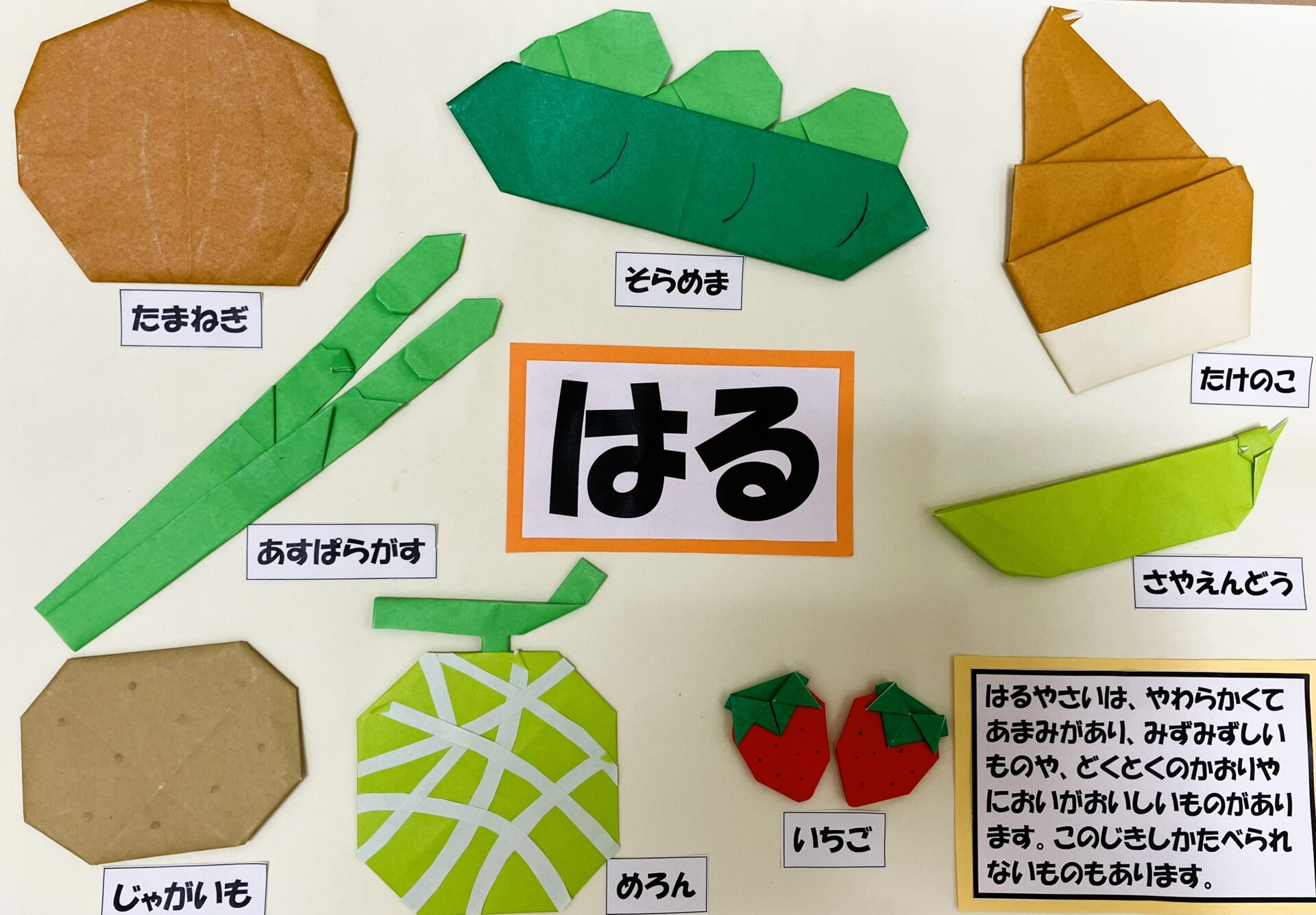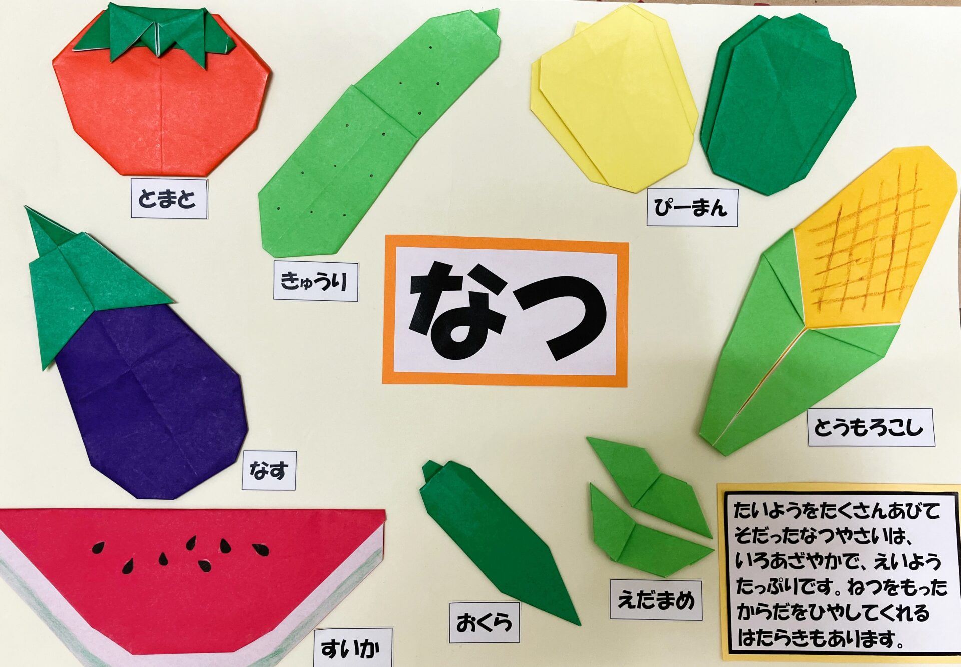 次に、「旬の食材」について話をしました。折り紙で作った食材を見ながら野菜当てクイズを行いましたが、ほとんどの野菜を覚えていて、しっかりと答えてくれました。