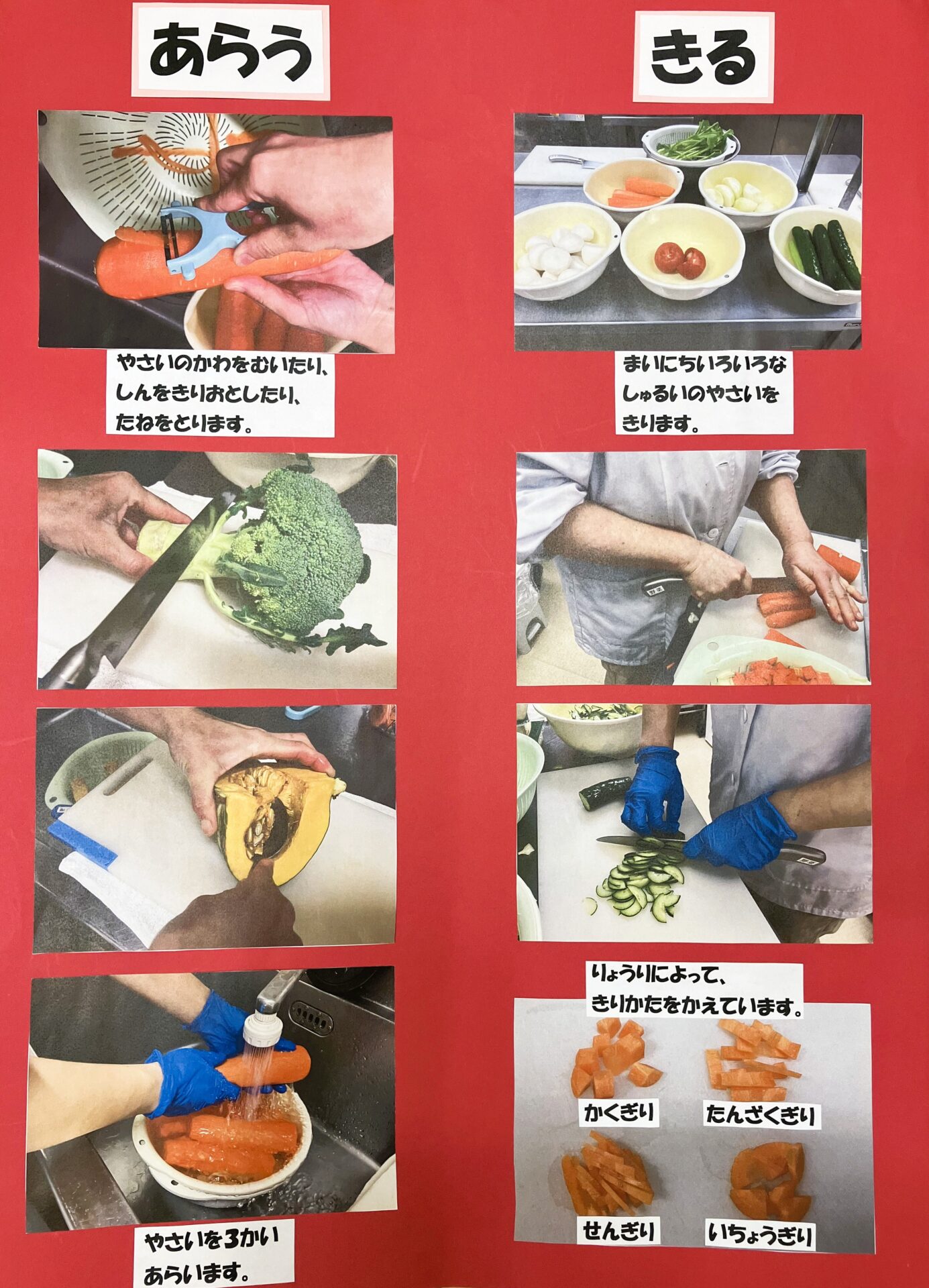 「こんなにたくさんの野菜を切っているんだ!」、「お皿は1枚ずつ洗っているんだね!」、「給食が出来るまでに色々な人が関わっているんだね!」などと一つずつ興味を持って反応する姿がみられて嬉しく感じました。
