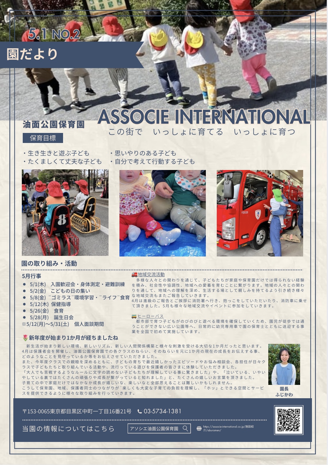 アソシエ油面公園保育園は0歳児から就学前までの定員67名の目黒区認可保育園です。