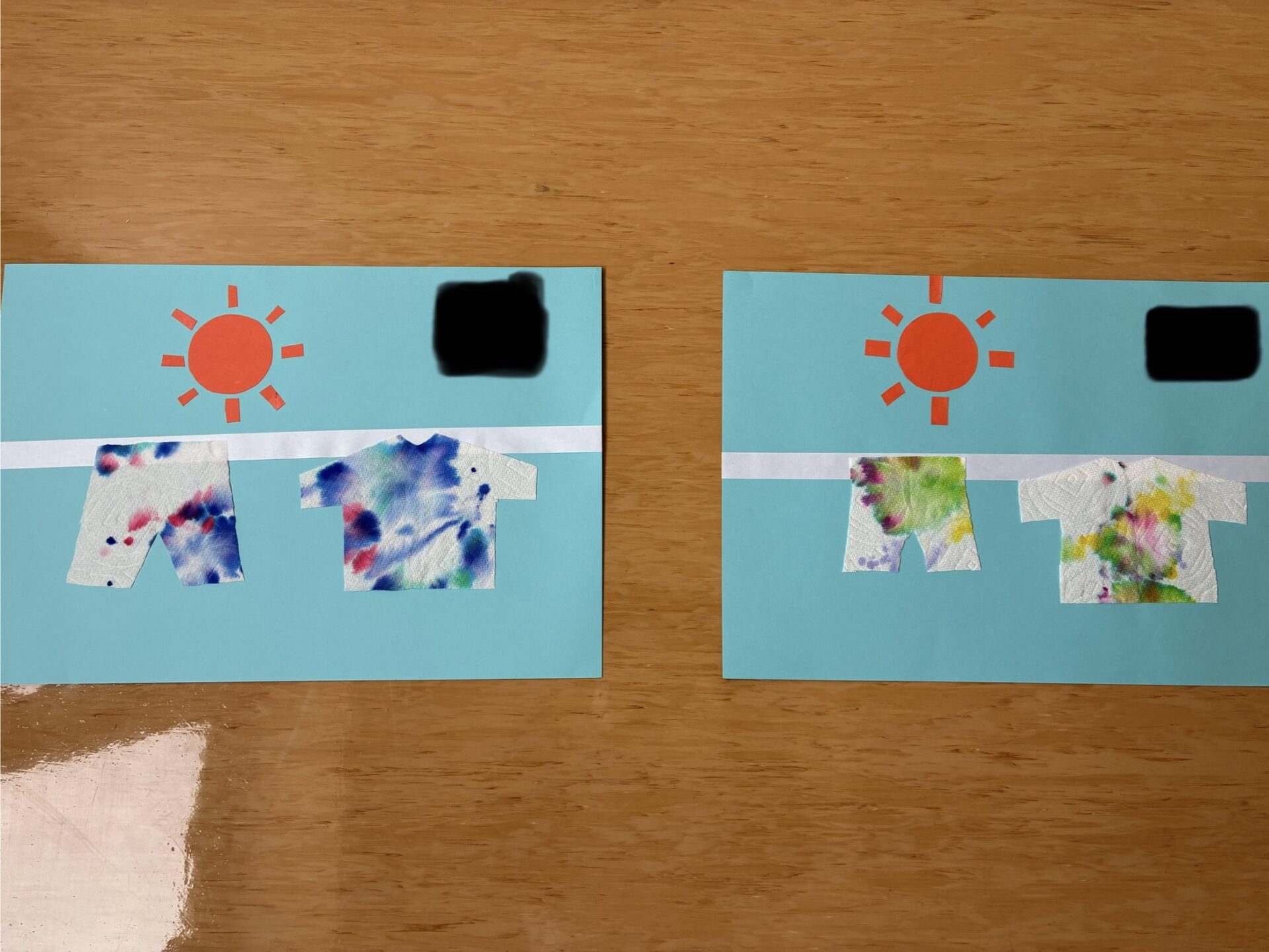 子どもたちがキッチンペーパーに水性ペンで点や線を自由に描きました。そこに水のついた綿棒を当てて模様を滲ませました。水を当てることで点や線が合わさり予想もしない綺麗な模様になりました!