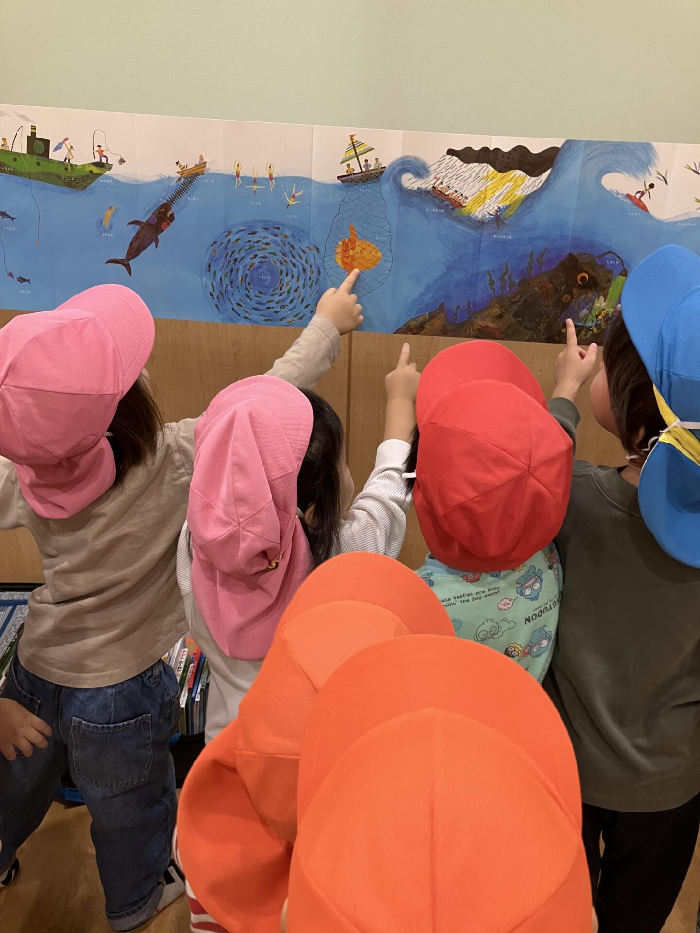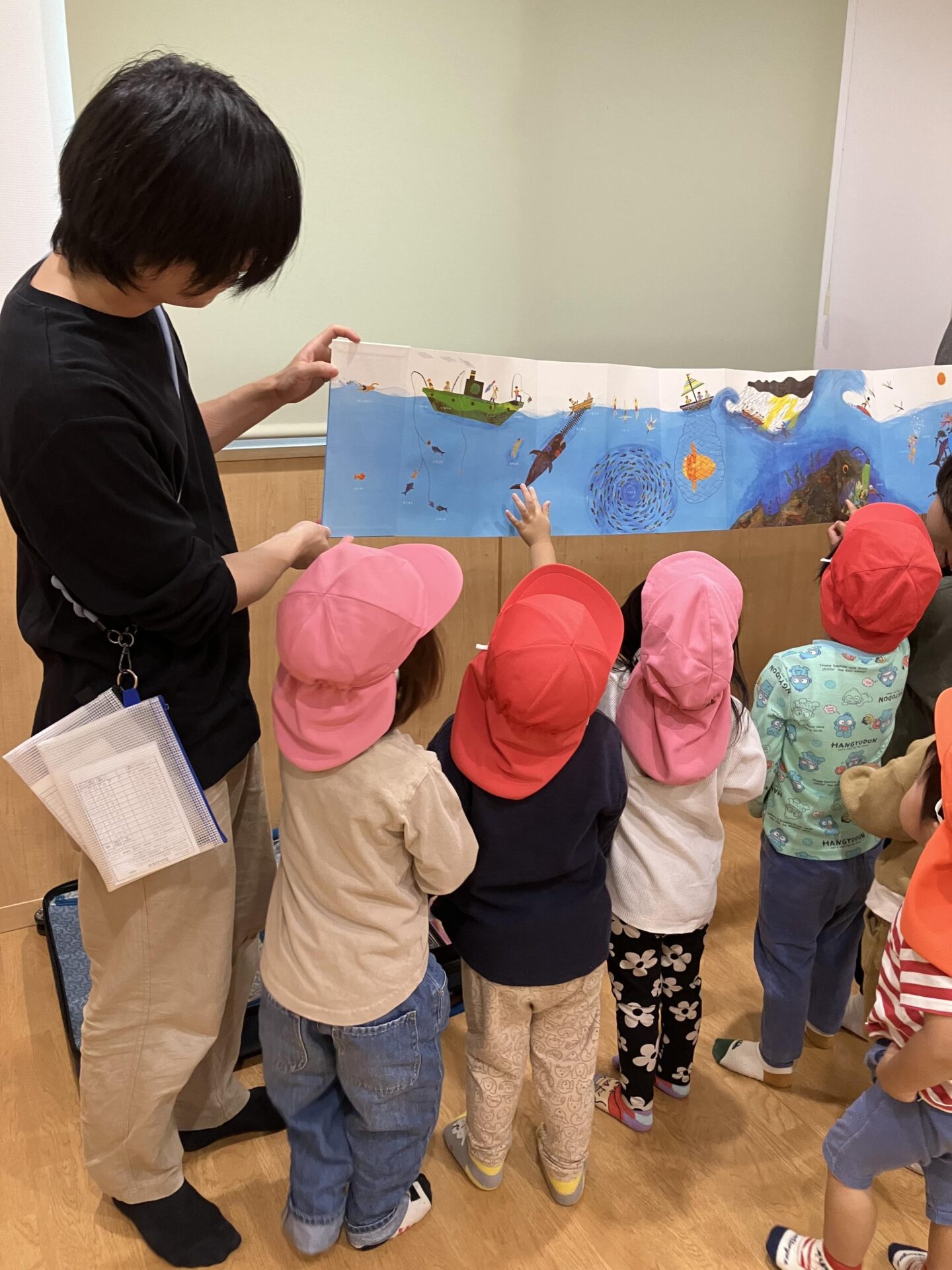 次はたくさんの海の生き物が描かれているジャバラおりの絵本をみんなで広げてみました。
