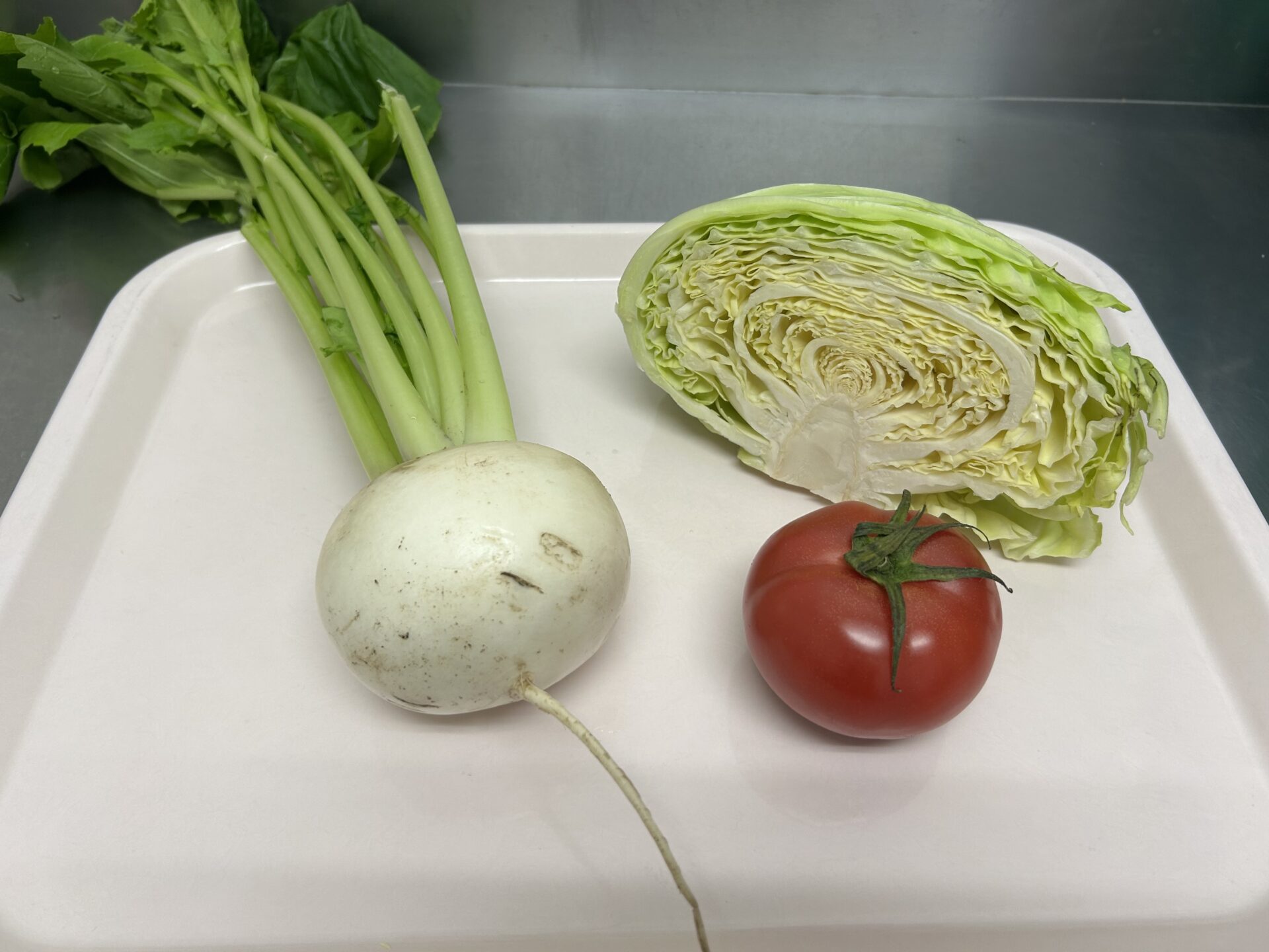 収穫物のかぶの他に、トマト、きゃべつを用意しました。