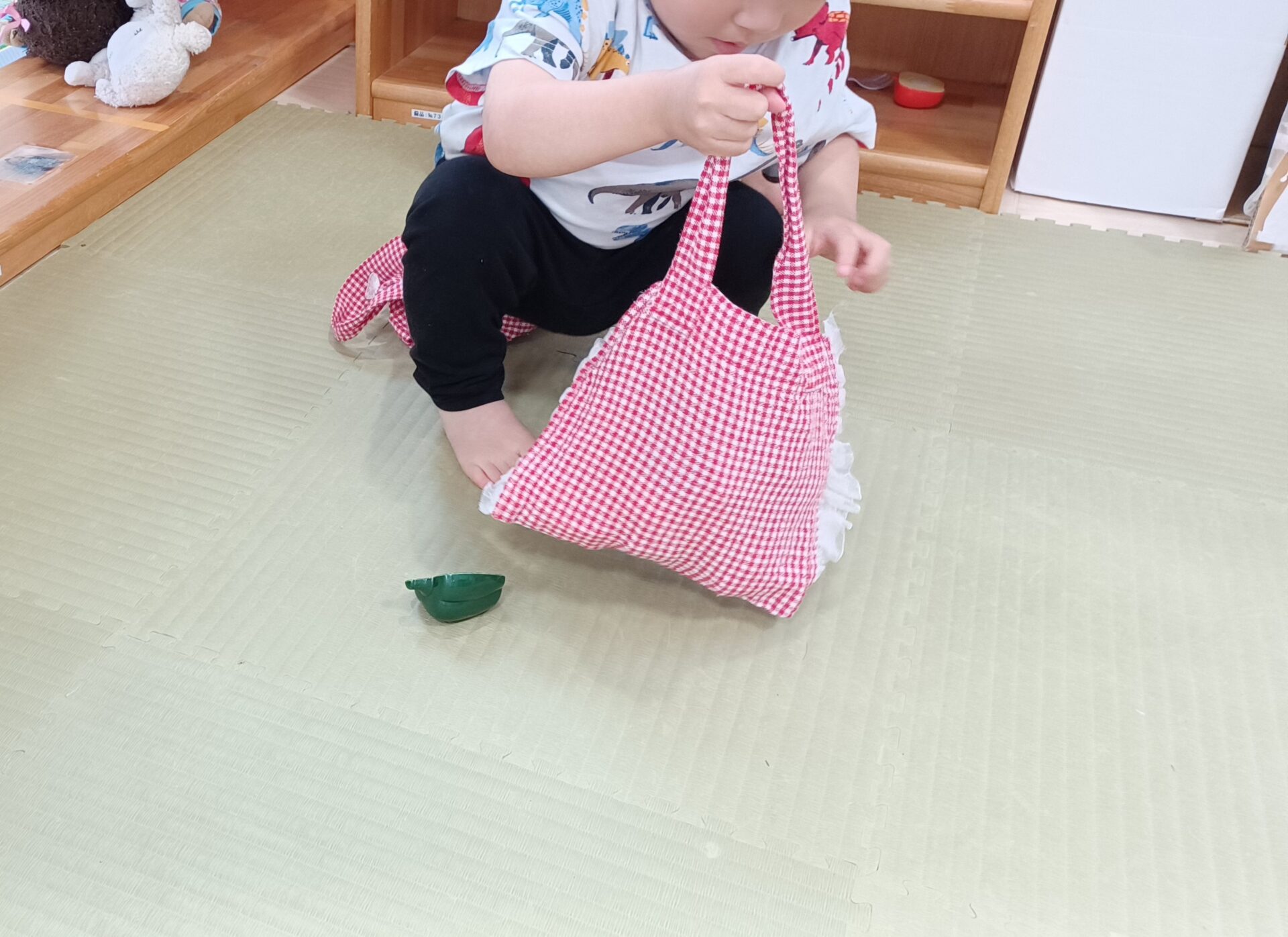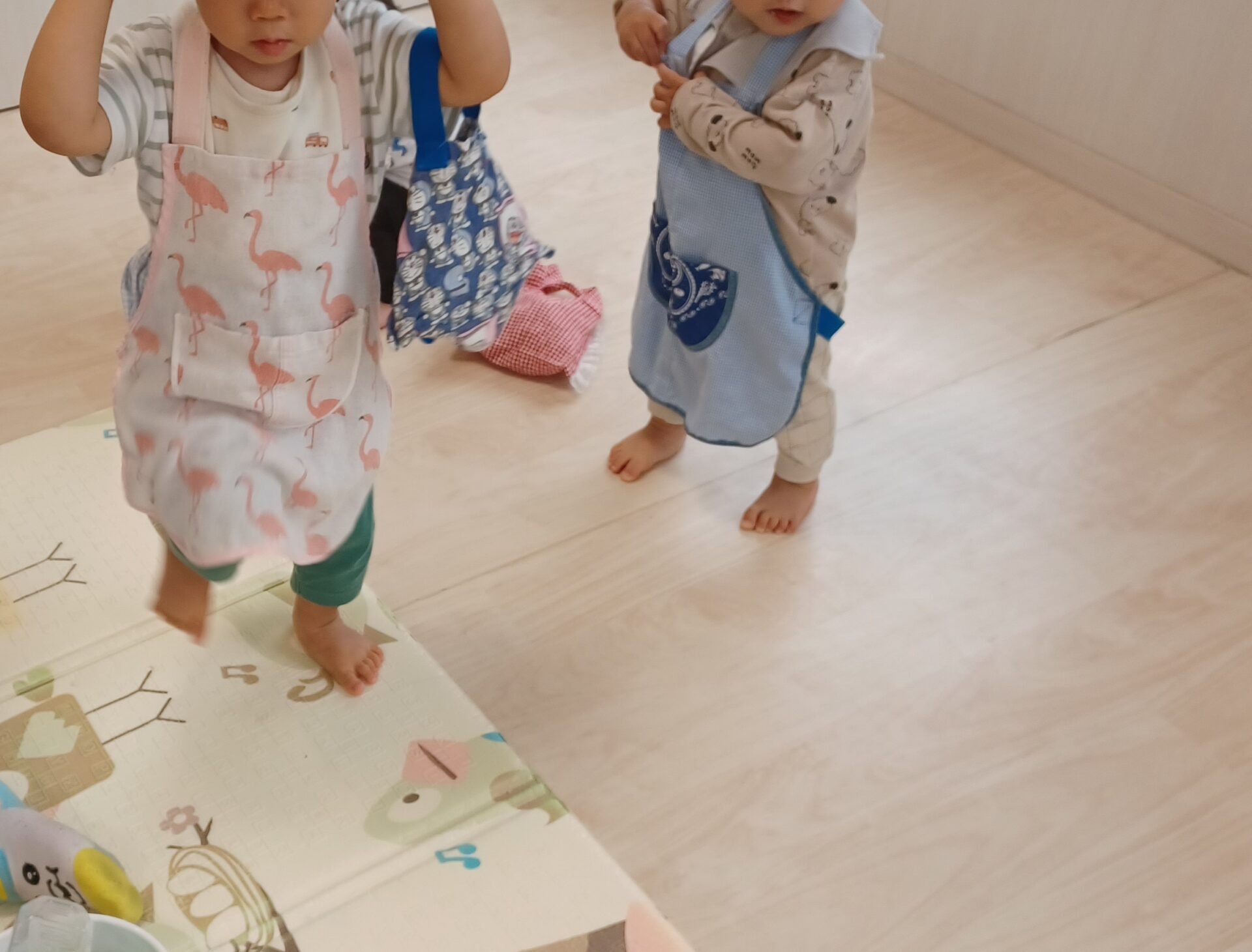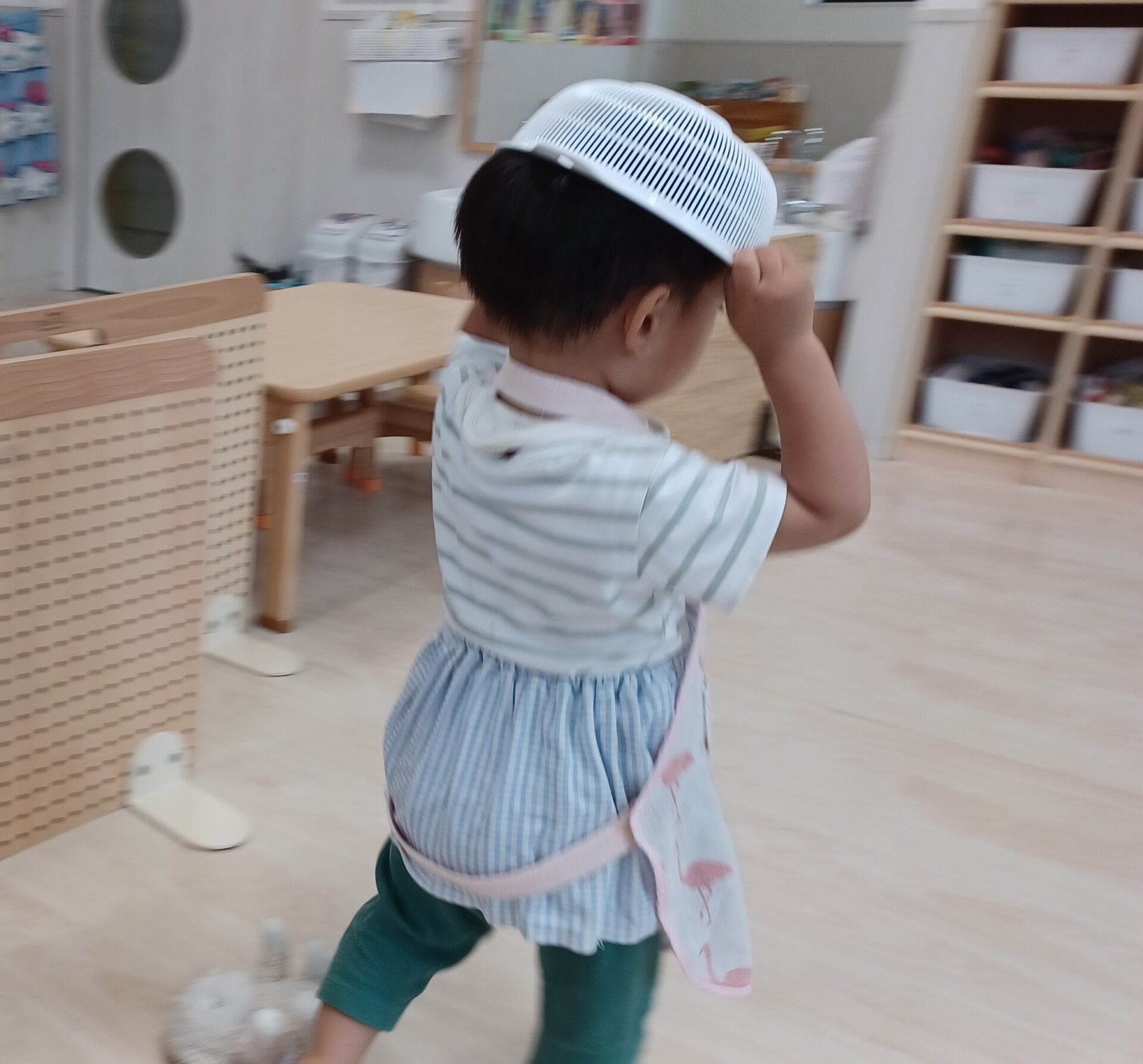 それぞれお気に入りのエプロンの柄があるようです。かごから出して保育士につけてほしいと言ってきます。