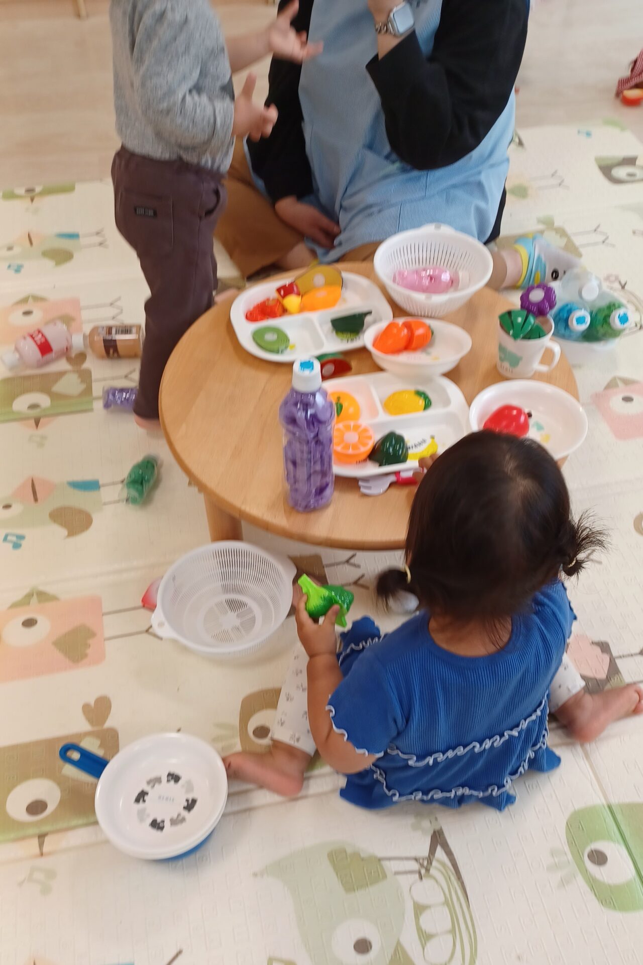 ごっこ遊びに関心を持ち始めた1歳児の子ども達です。お友だちがやり始めたことをまねたり保育士とのやり取りのなかで遊びが発展しているようです。