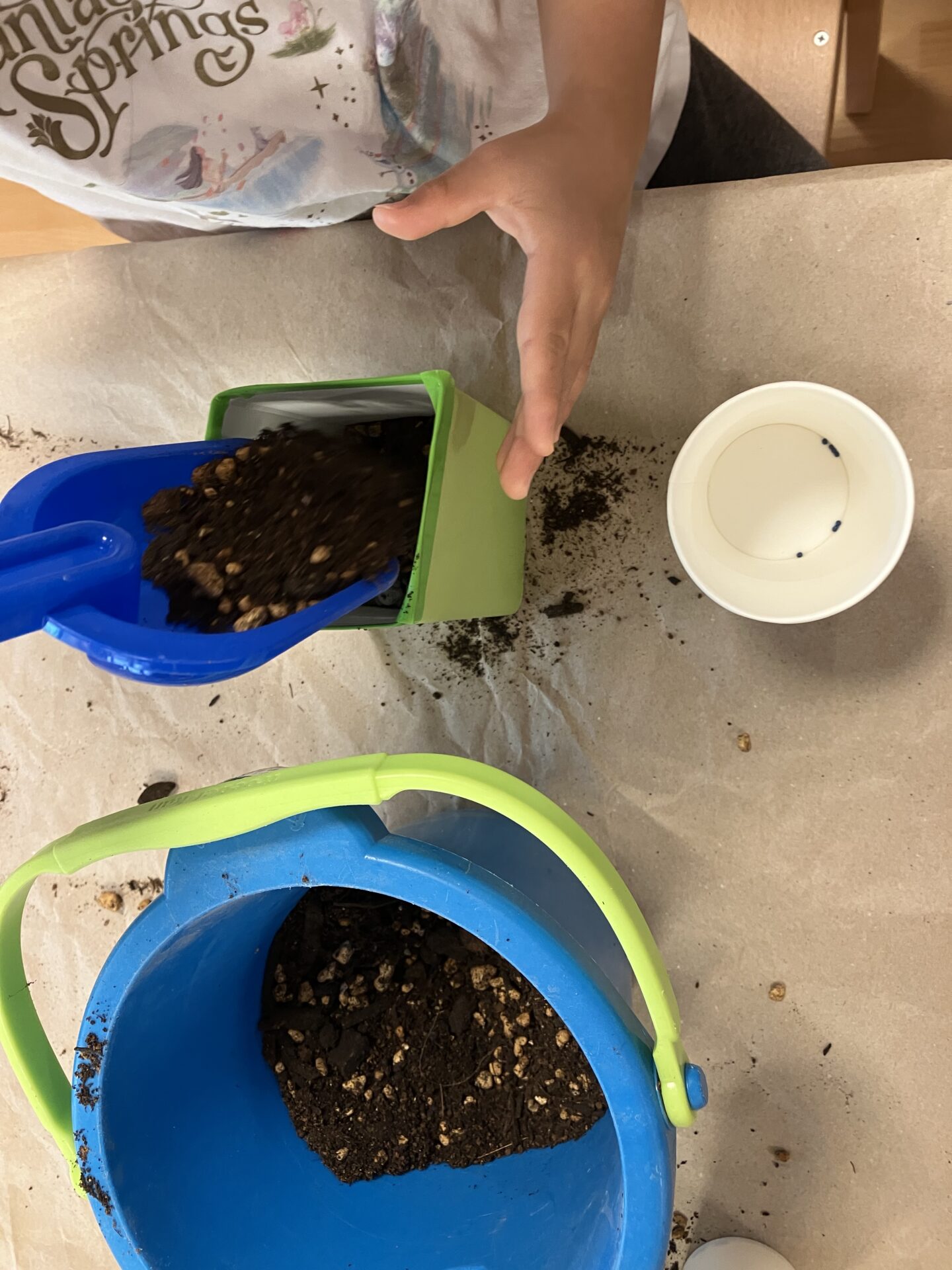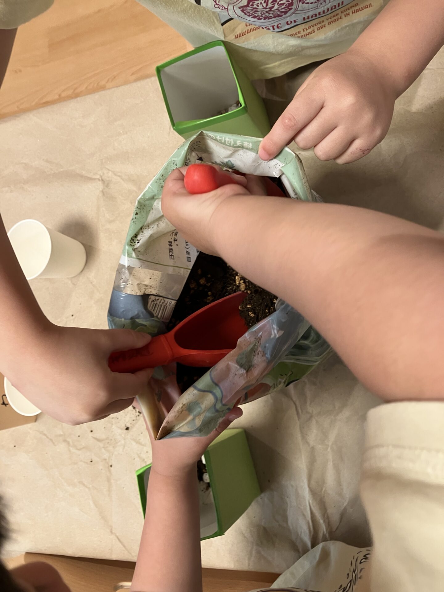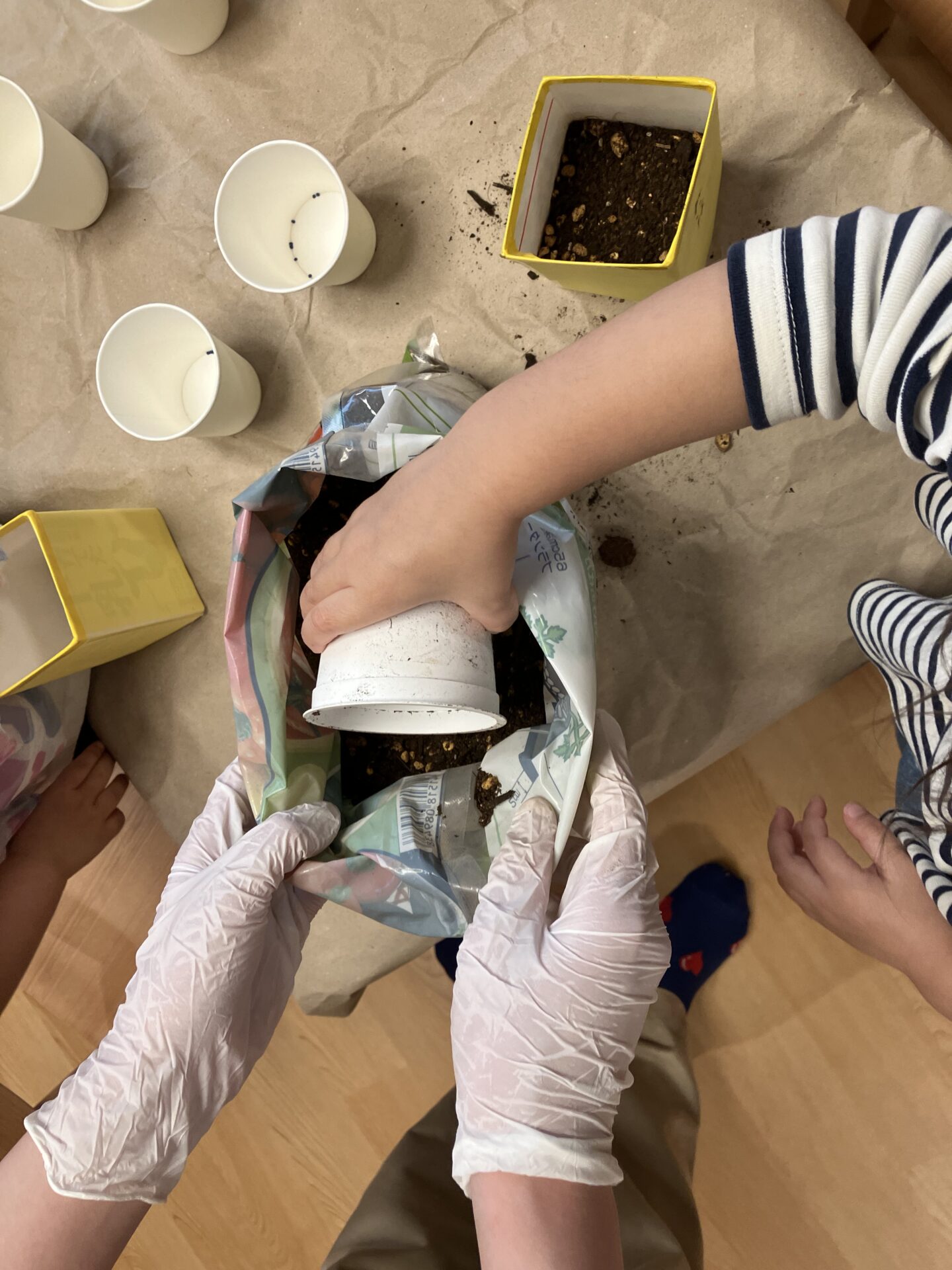 線が描いてあるところまで土を入れました。お友だちと譲り合い、楽しそうに作業していました。