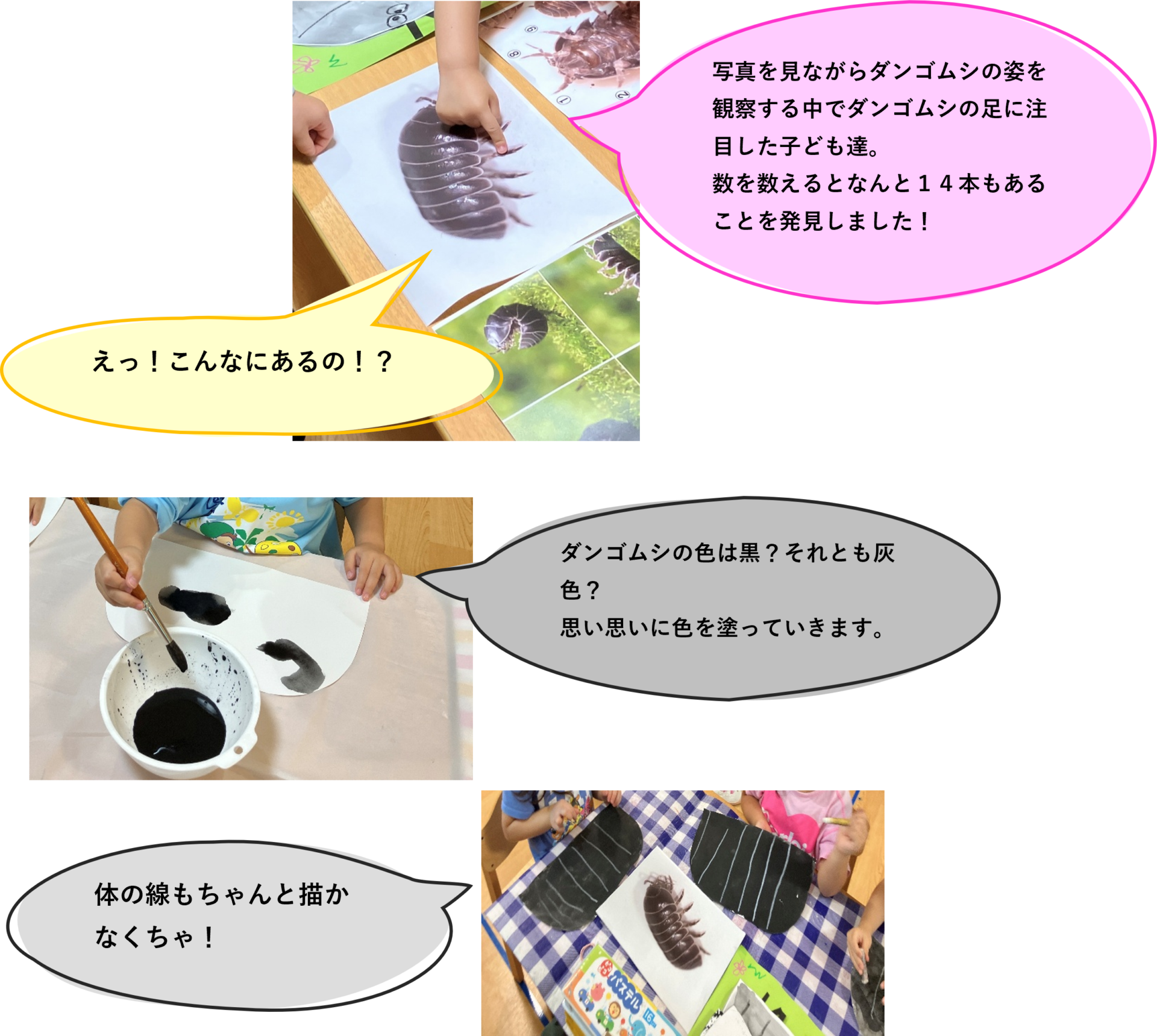 子どもたちの興味に合わせて保育者がダンゴムシの絵本を本棚に置くと、ダンゴムシの食べるものや住む場所を知り「ダンゴムシってこうなってるんだ!」とよりダンゴムシへの興味が高まった子どもたち!