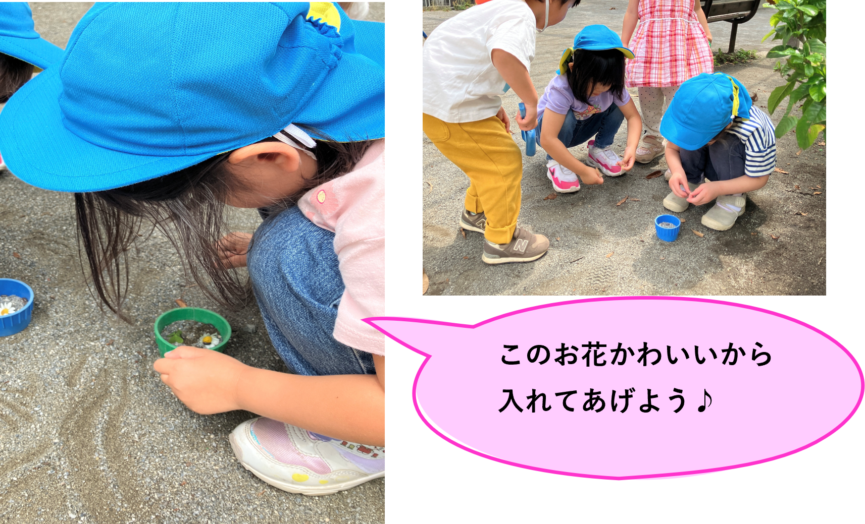 最初のうちは「だんごむしどこかな?」と手当たり次第に探していた子どもたちでしたが、探していくうちにダンゴムシが良く見つかる『ダンゴムシスポット』を見つけました。捕まえたダンゴムシは器に入れて観察していましたが、「ダンゴムシさんにお家を作ってあげたい」「花と一緒の方が嬉しいかな」という子どもたちなりの思いで器に砂を入れたり、花を入れたりと飾るようになりました。