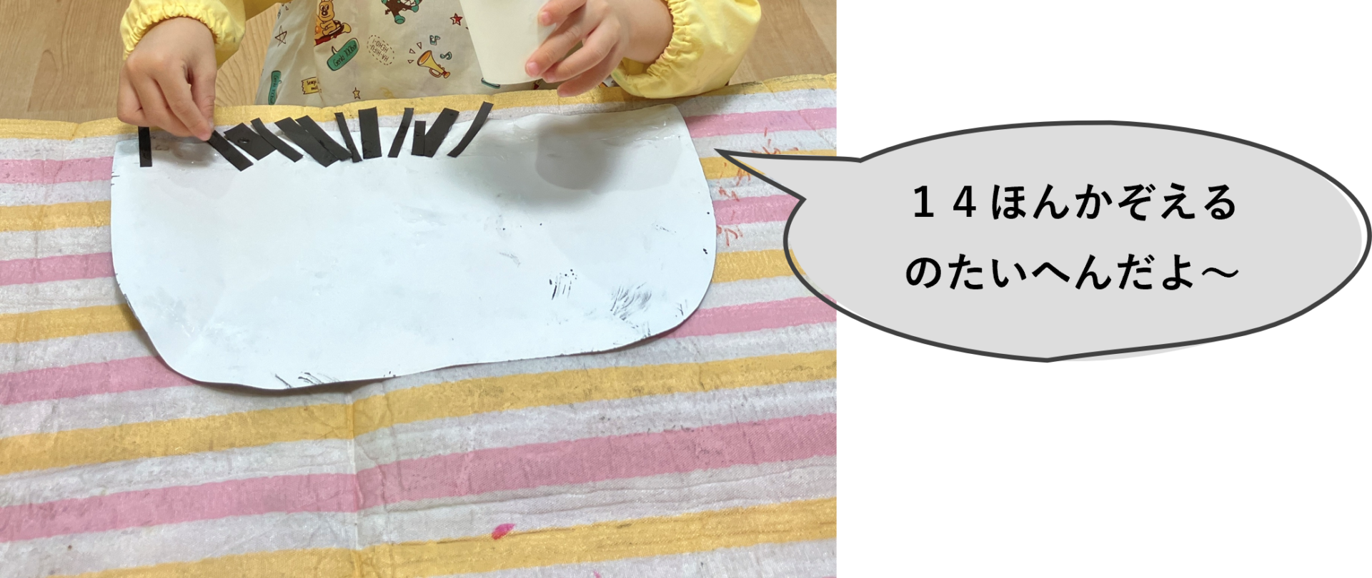 ハサミで切った足を貼り付けていきます。ちゃんとダンゴムシ足の本数貼れるように「1.2.3…」と保育者と一緒に14本数える子どもたち。