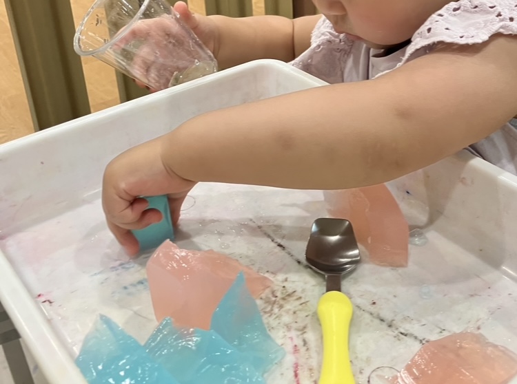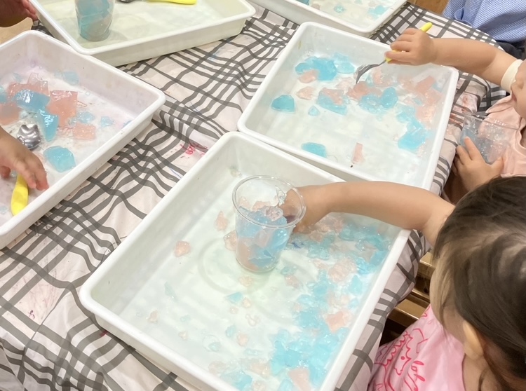 ピンクと水色の寒天をそれぞれに配り、好きに触ってもらいました。