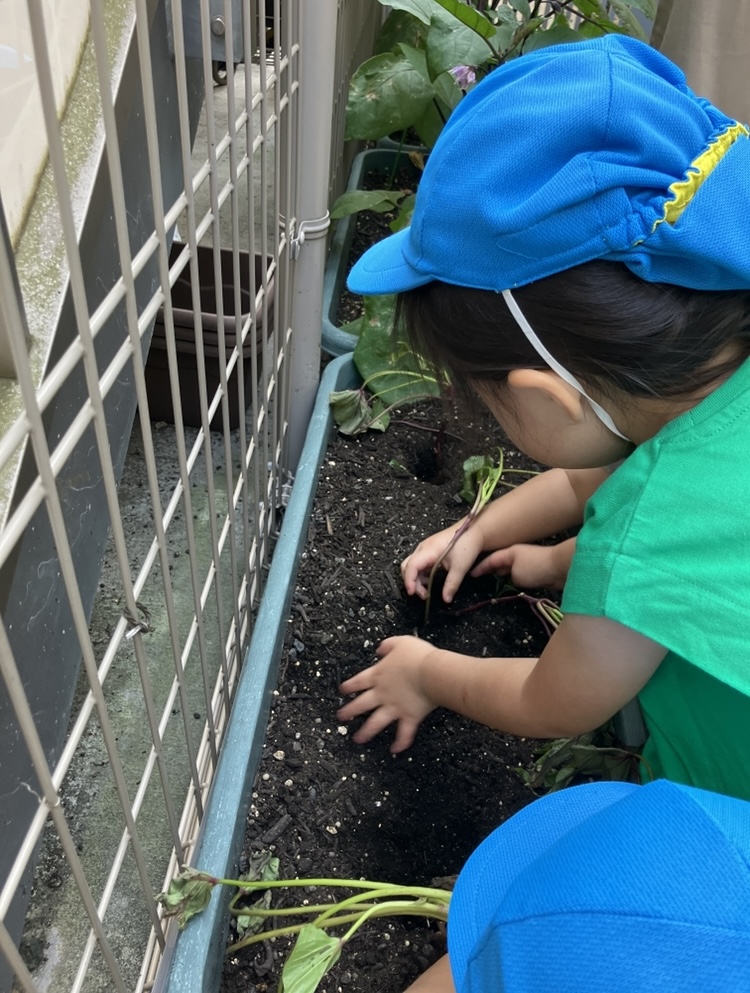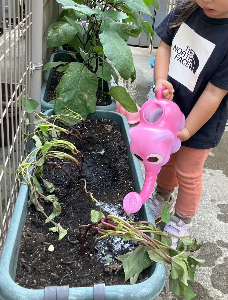 「大きくなりますように!」と手を合わせてお願いして、「さつまいもさんが喉乾いたらお水あげてくれる人?」と聞いてみると、勢いよく手を挙げて意欲ばっちりな2歳児クラスの子どもたちです。
