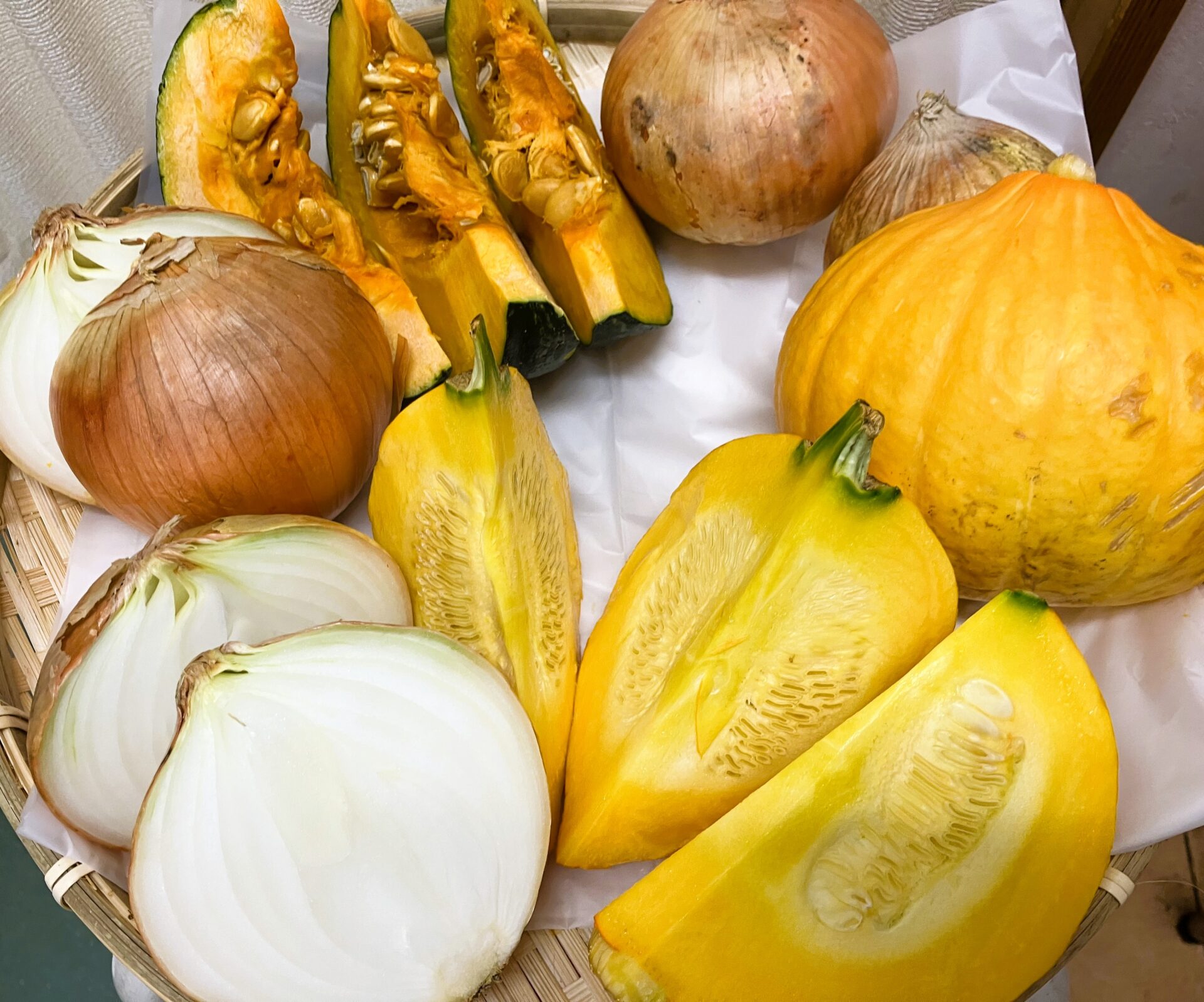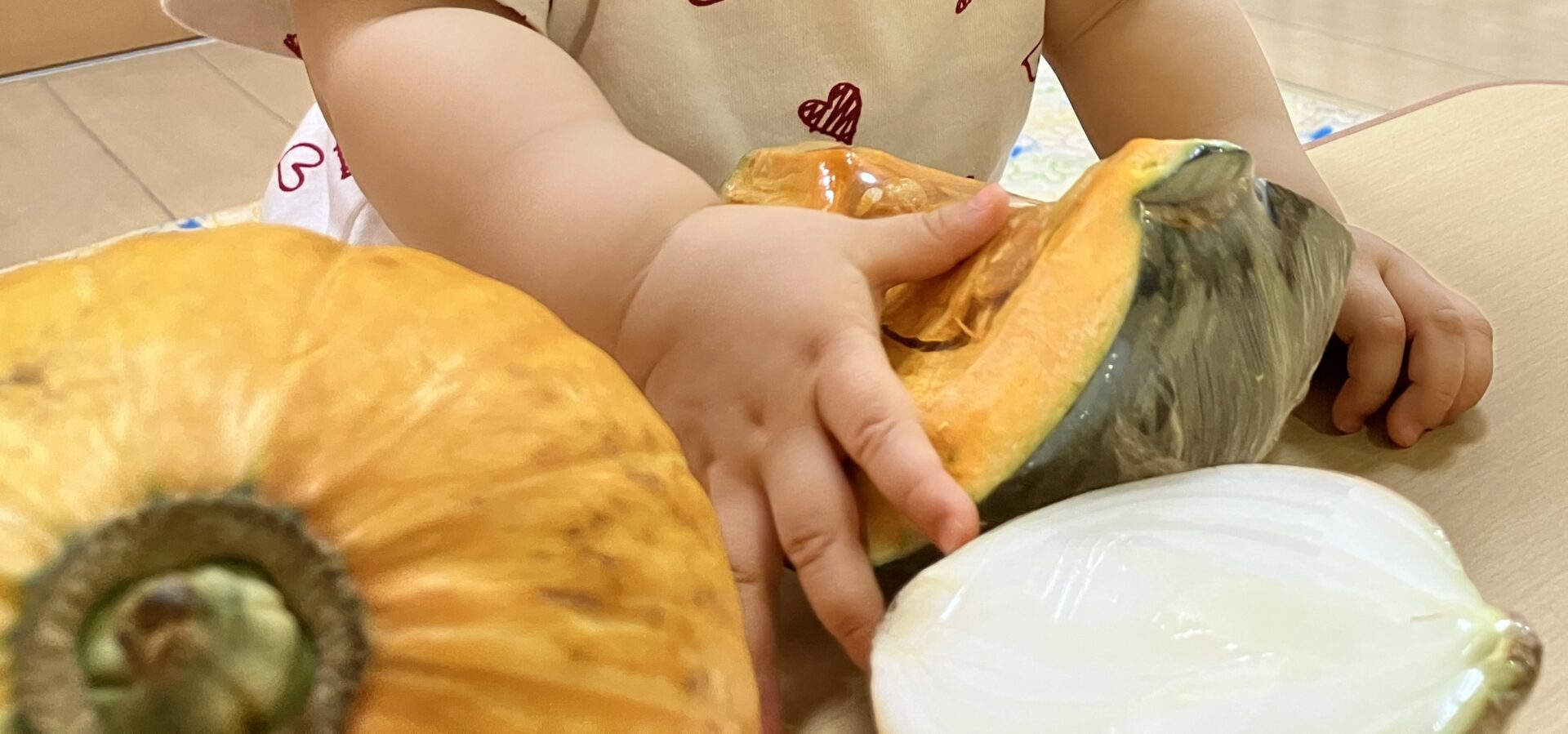 今月の食育活動はかぼちゃと玉ねぎを用意して、自由に触ってみる事にしました。