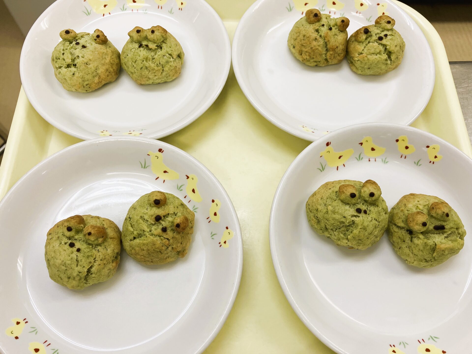 小松菜とバナナをペースト状にして生地に混ぜ込み、かえるの形に成形して、