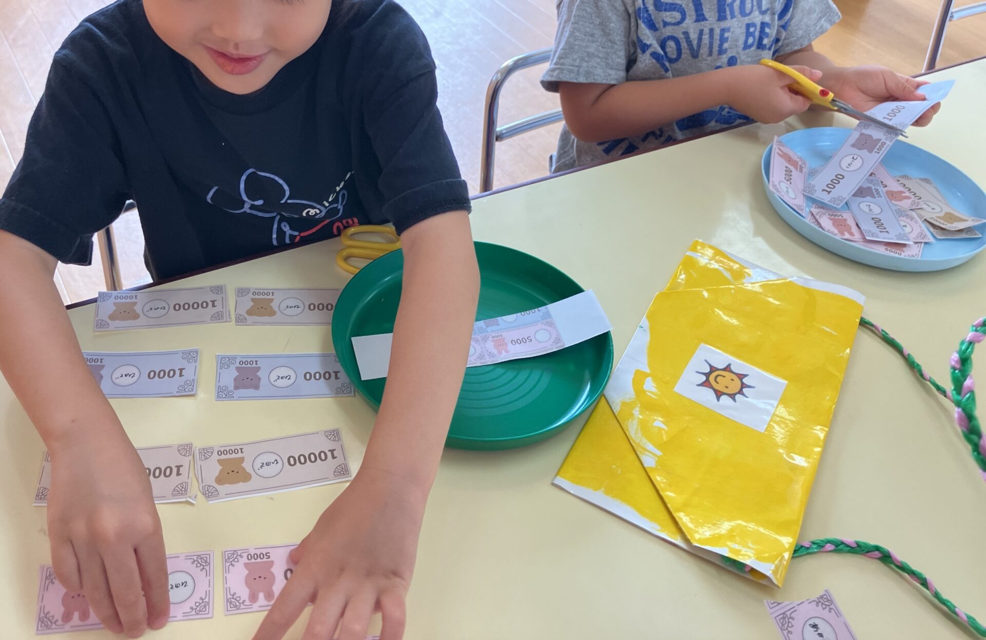ドーナツやさんごっこに向けて、みんなでお財布とお金を手作り。