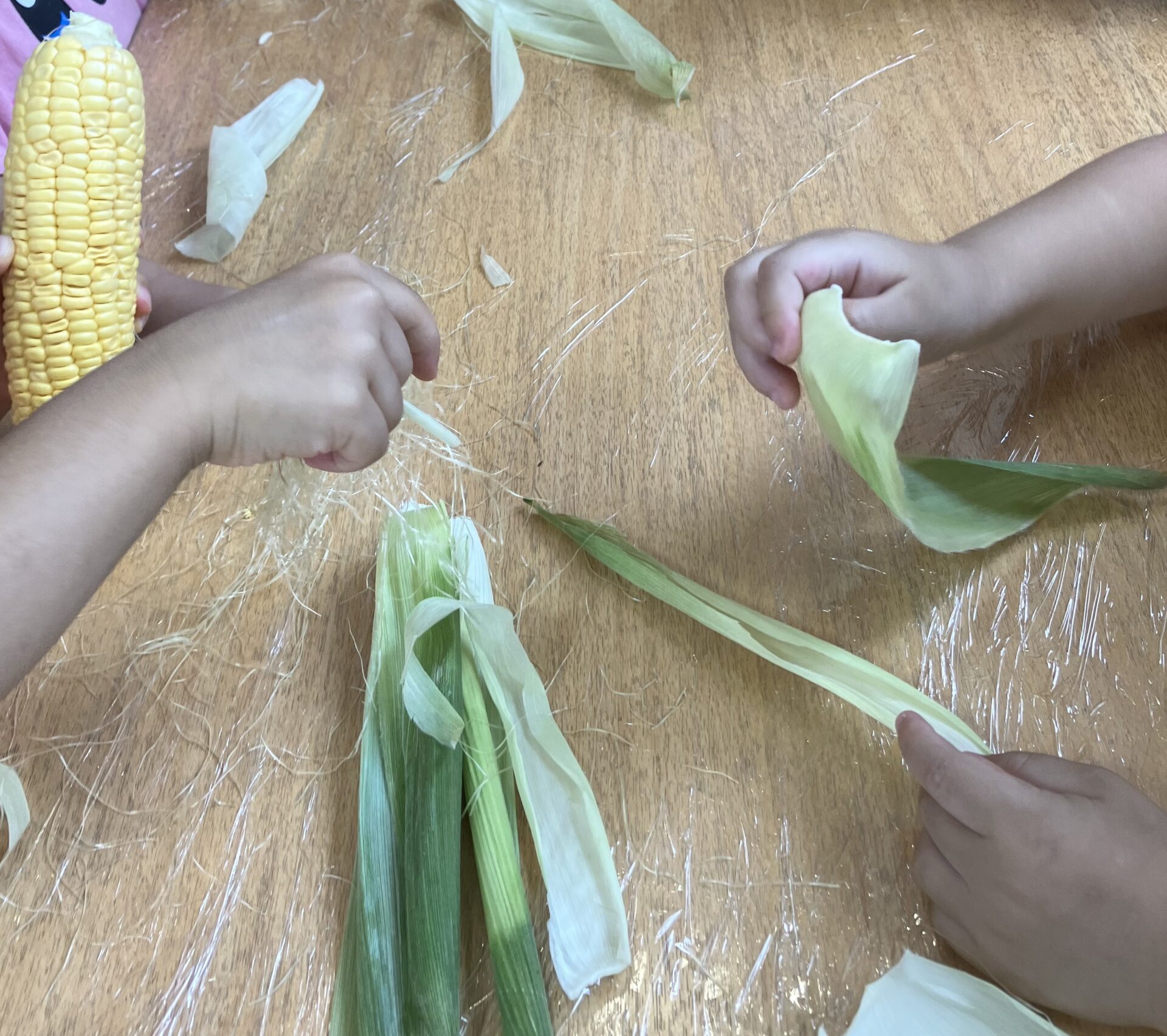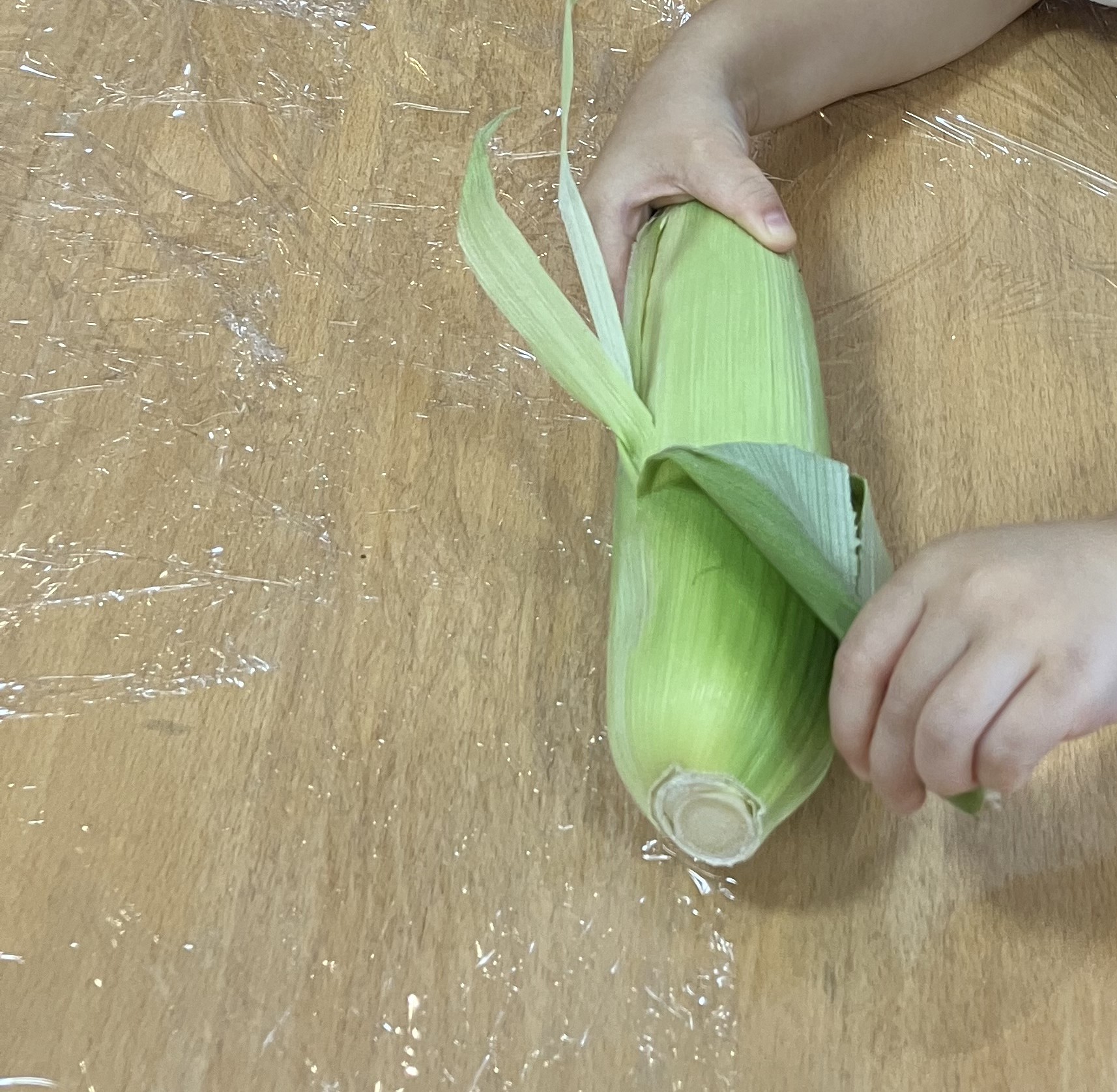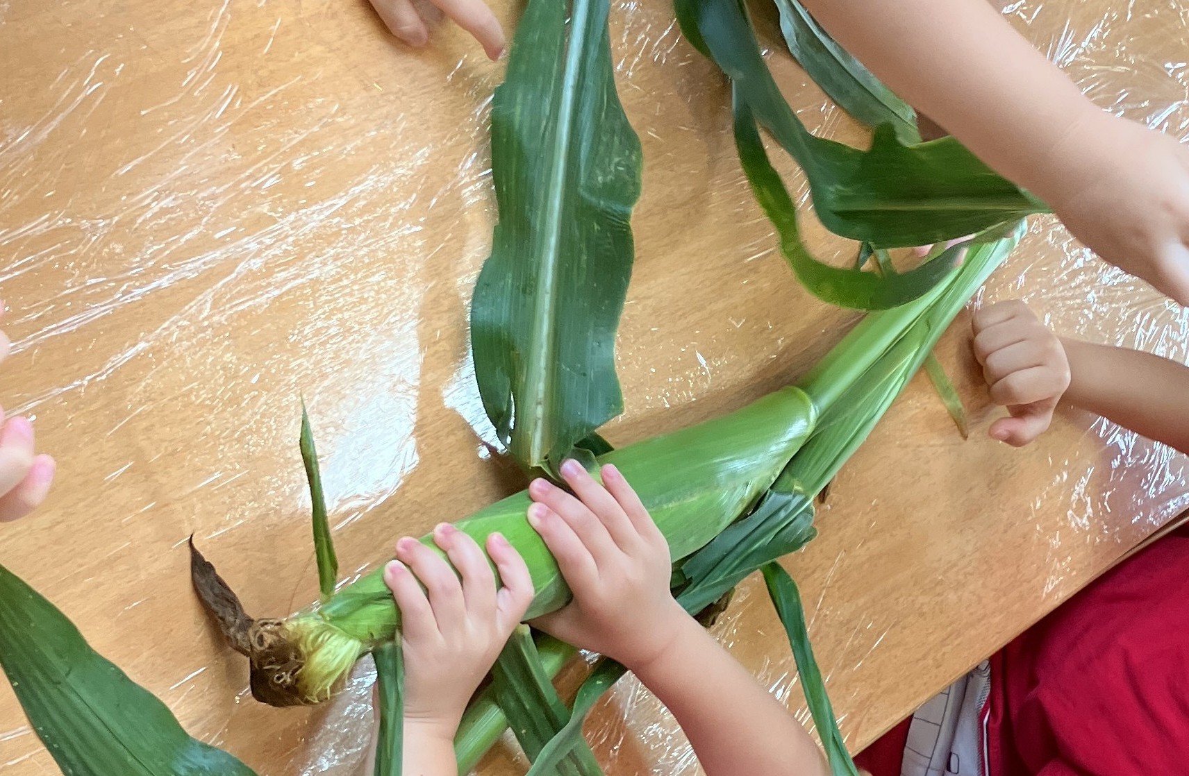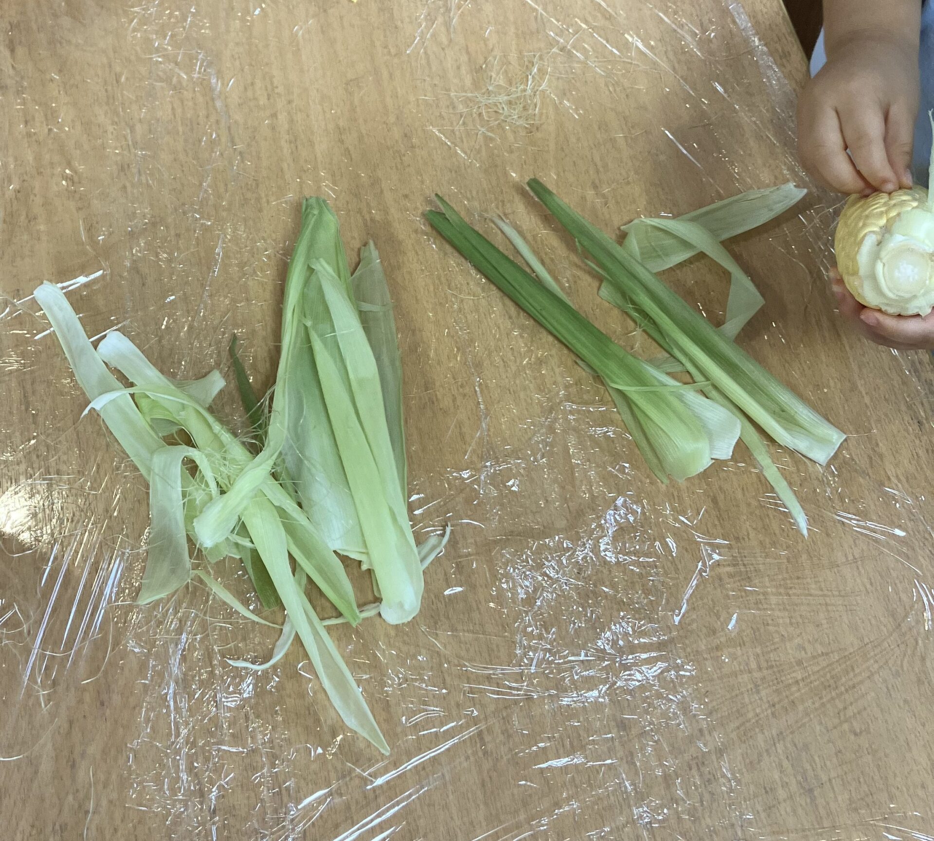 今回はぱんだ組でとうもろこしの皮むきを行いました。
