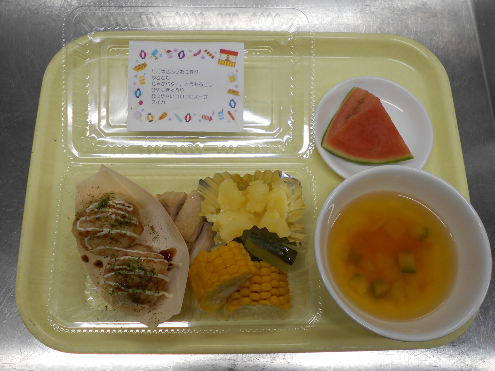 7月の誕生日会メニューは、夏といえば「お祭り!」にちなんで、お祭りにでよく出てくるメニューでした。子どもたちも「今日、たこやきの形をしたおにぎりだ!」「お弁当箱みたいで楽しかった!」などといつもと違う雰囲気で楽しく食べていました。