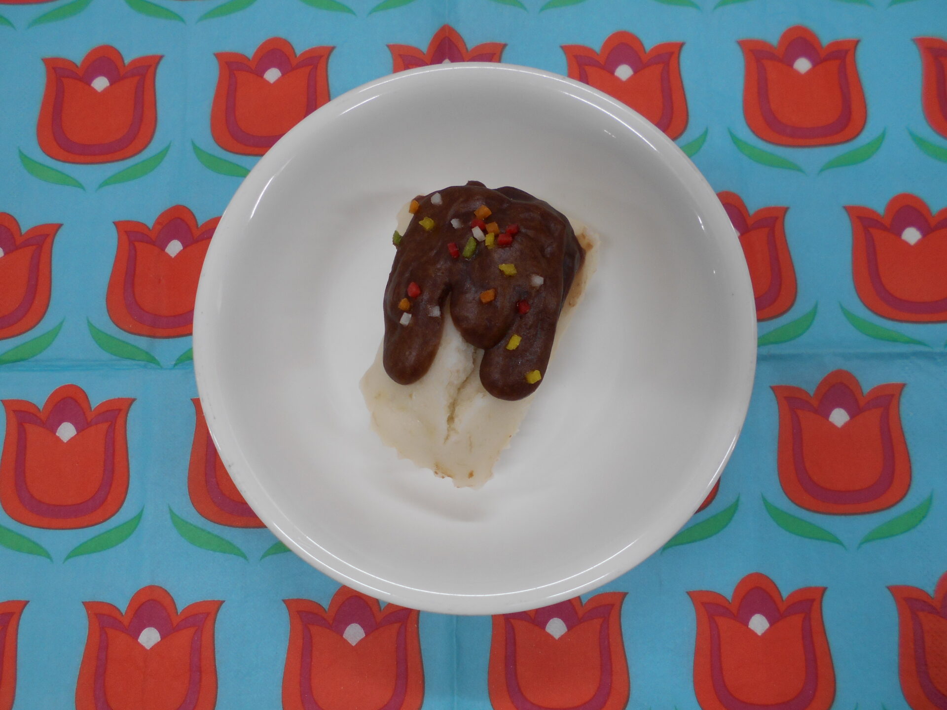 おやつは、チョコバナナ風蒸しぱんでした。チョコバナナ風ということで生地にはバナナが入っています。蒸しぱんが苦手な子もいつもと違う!と感じて食べていました。