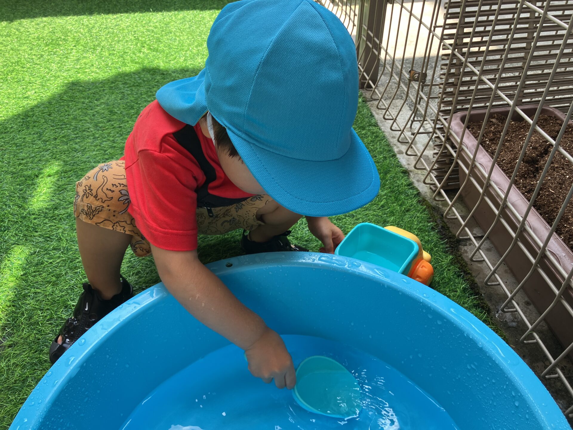 水をすくって容器に入れて遊んだり
