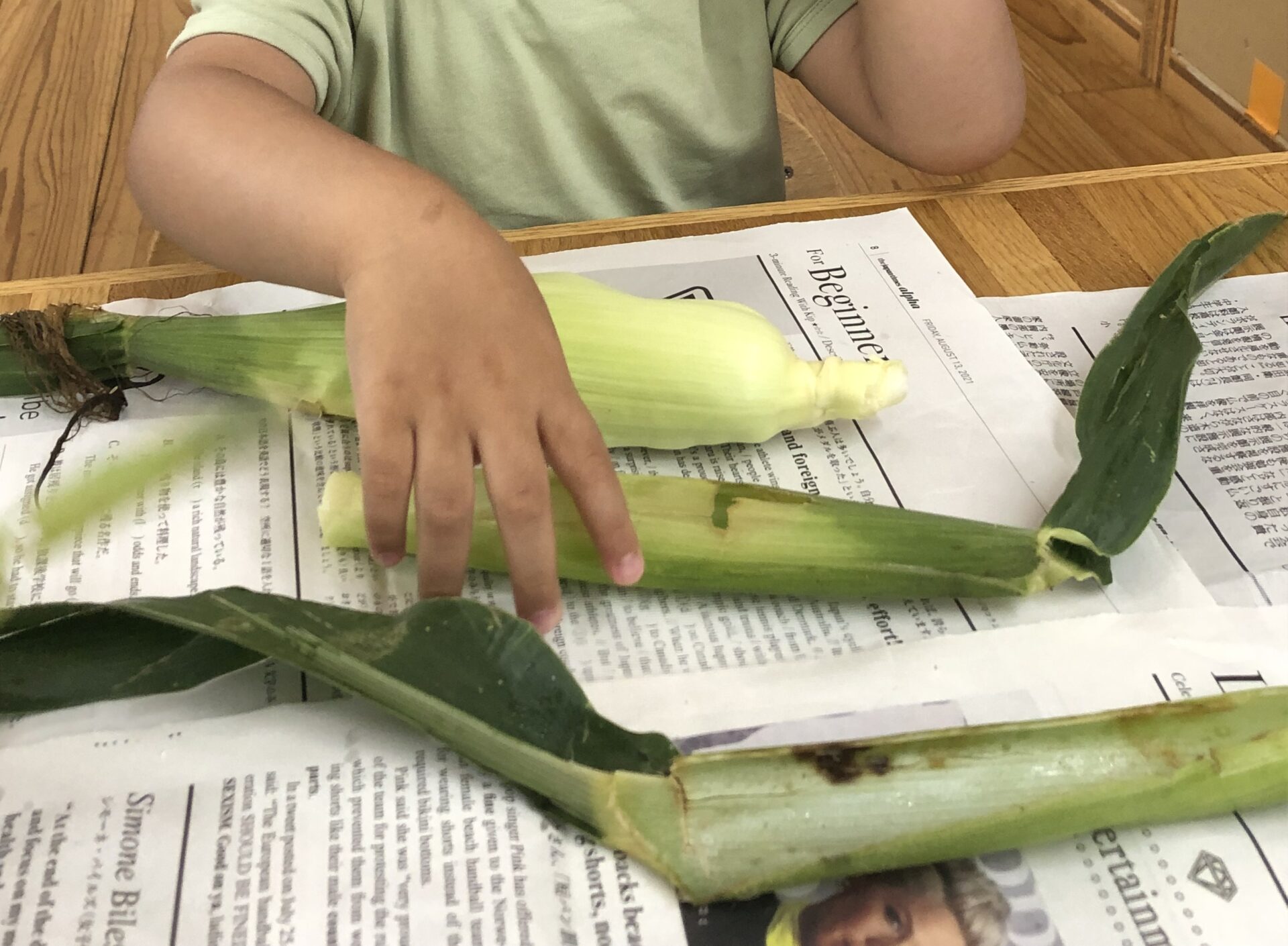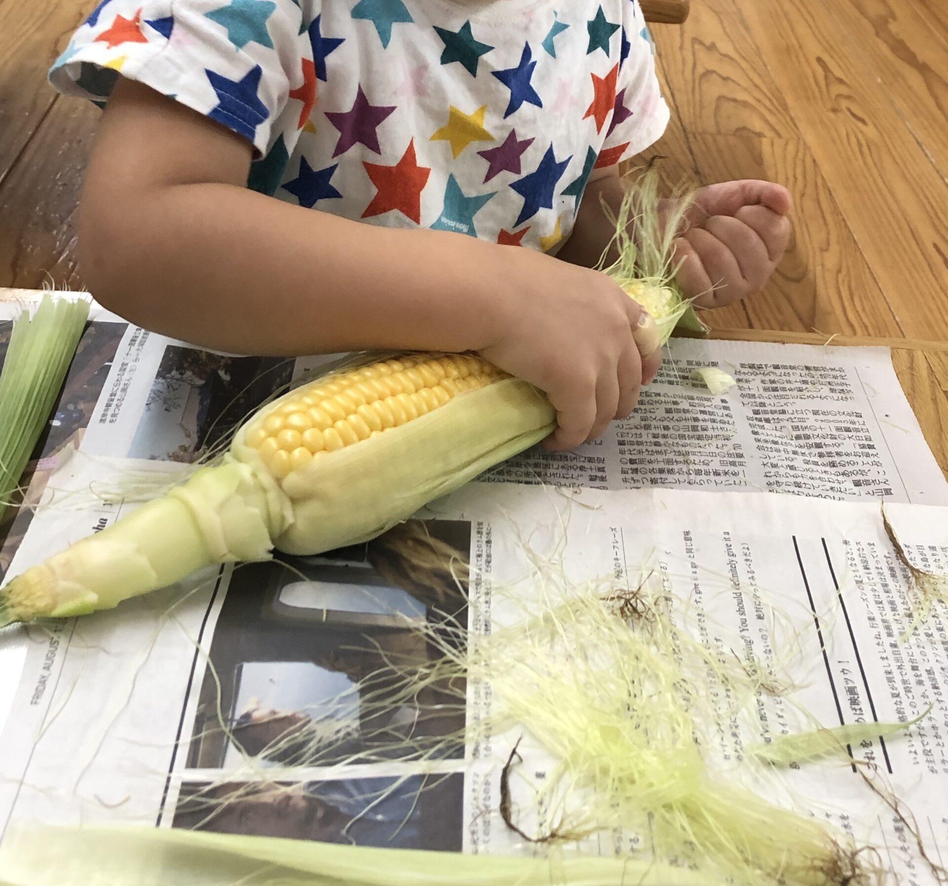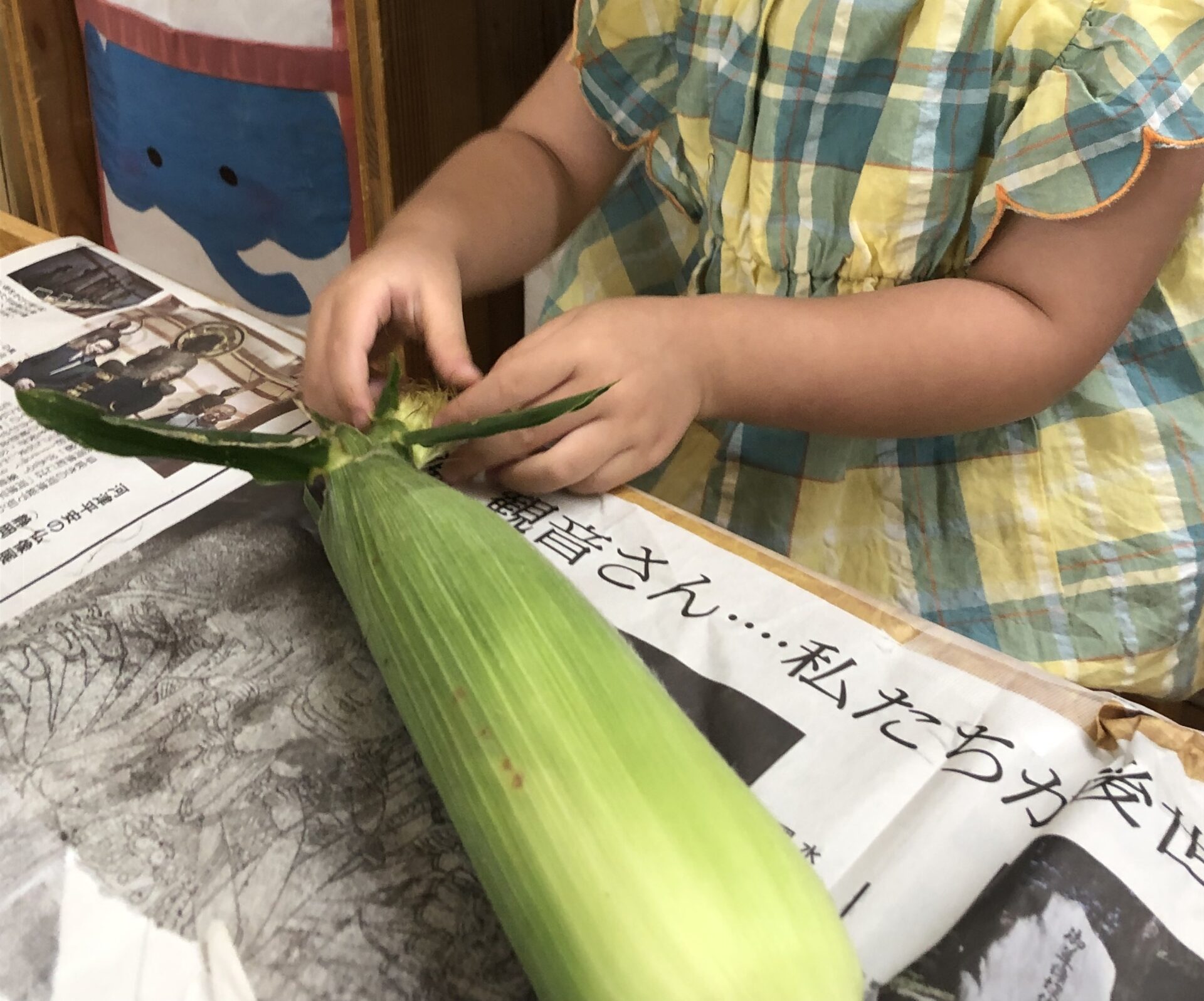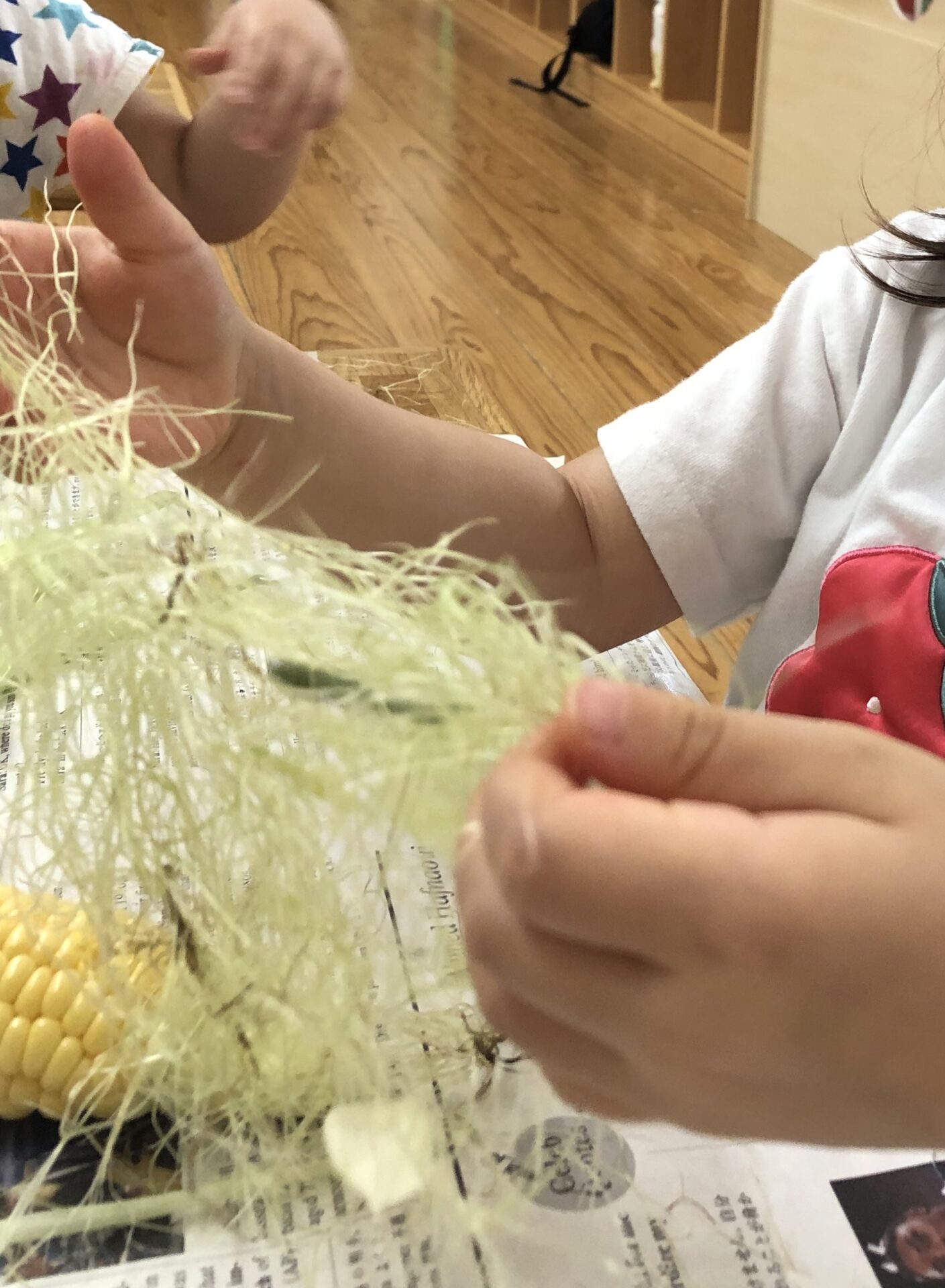 とうもろこしの皮、実、ひげの異なる感触や匂いを楽しみながら最後はひげもきれいにとってくれました☆