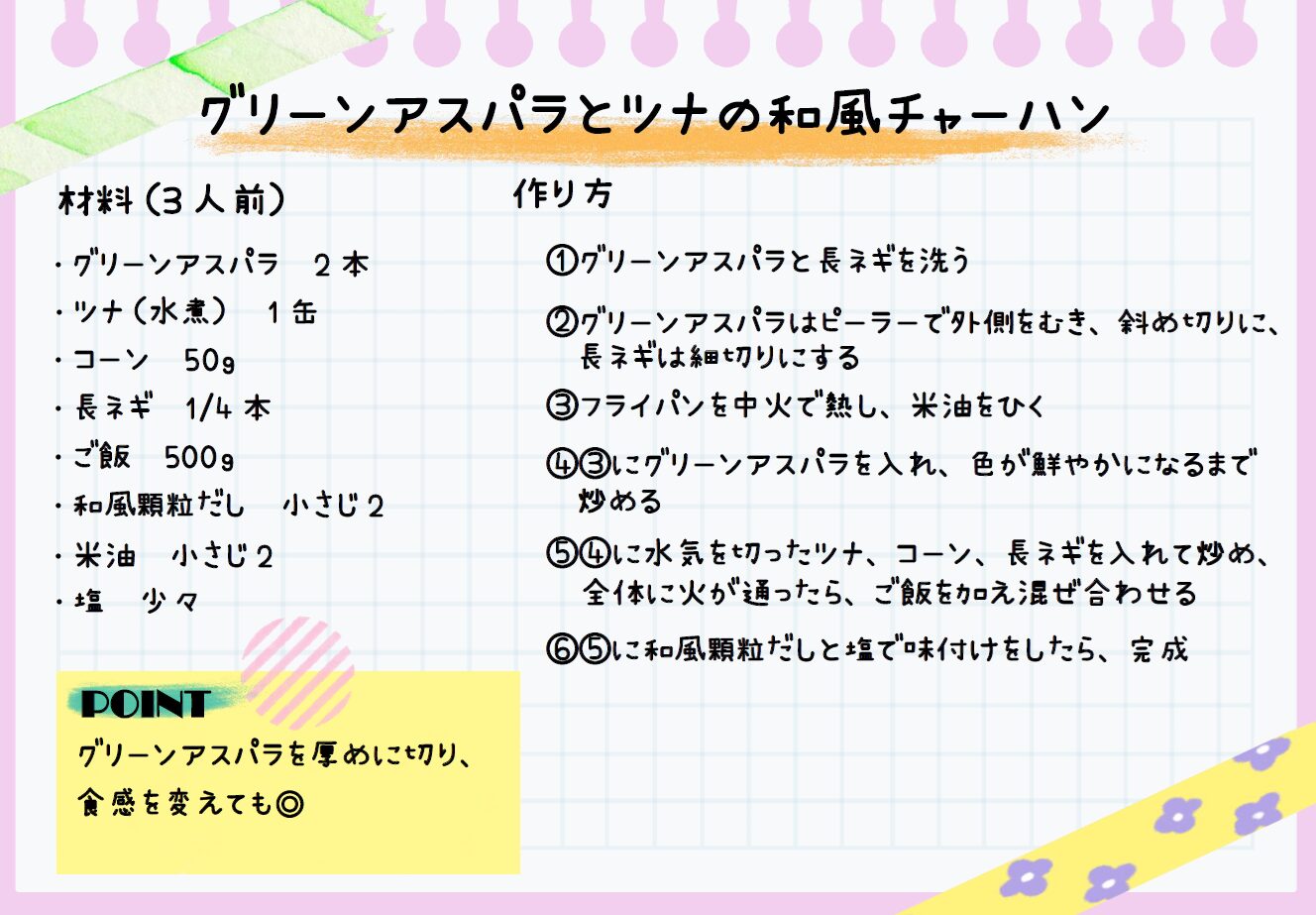 今月は、グリーンアスパラを使った「チャーハン」を紹介します。