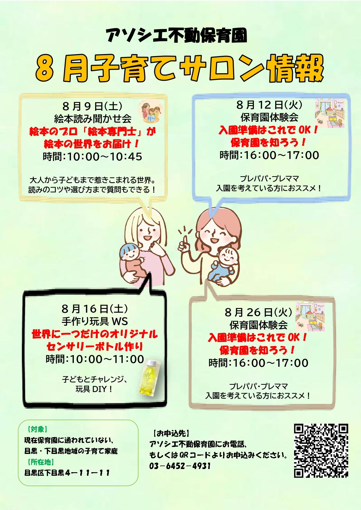 現在保育園に通われていない、目黒・下目黒地域の子育て家庭に向けた子育てサロンです。
