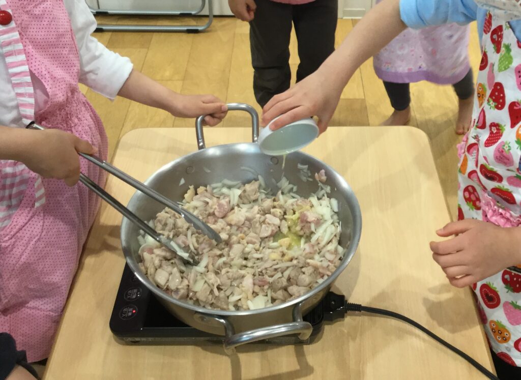今年度卒園する子どもたちと一緒に昼食のカレーライスづくりをしました。