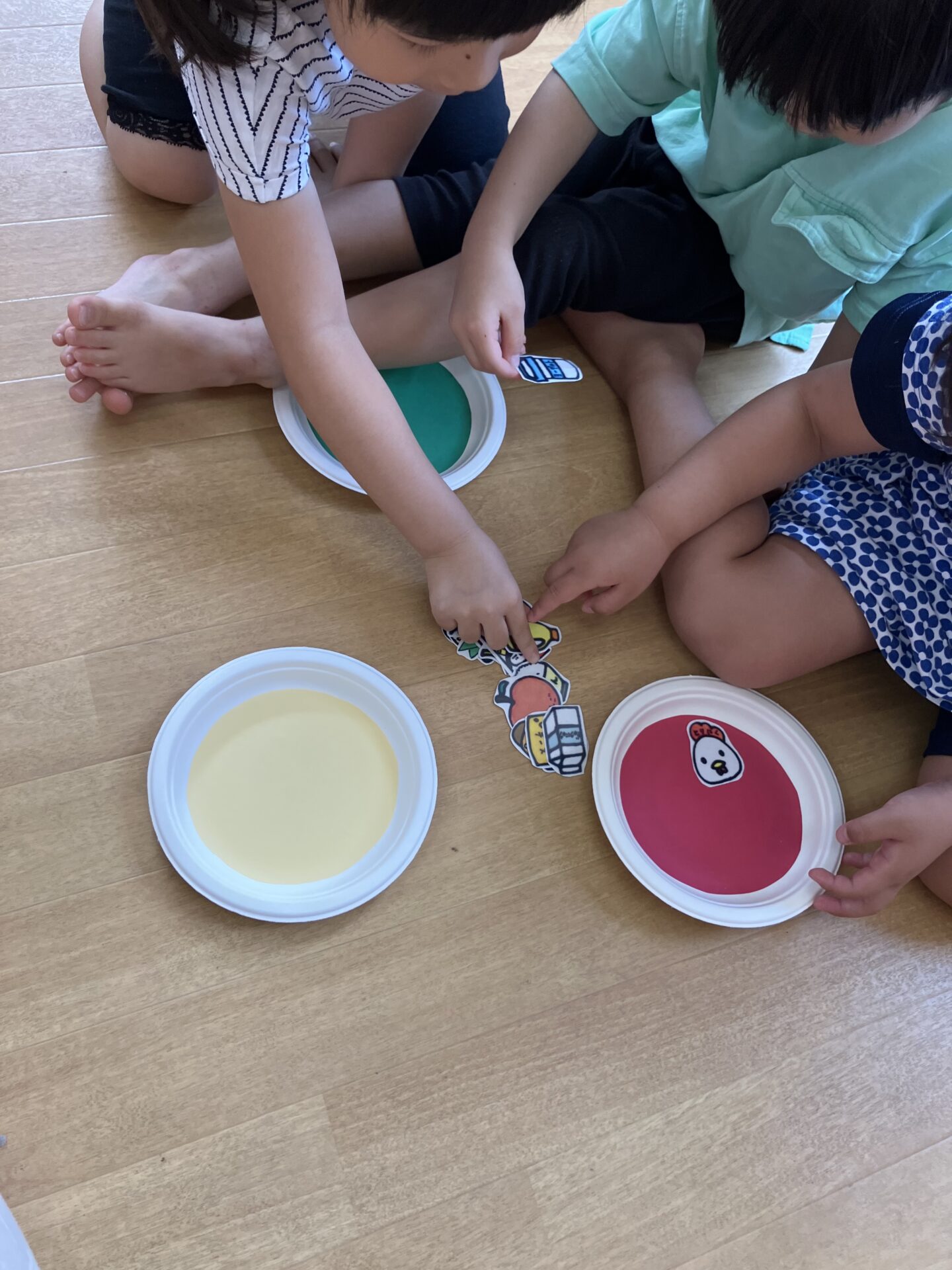 食材カードと三色のお皿を使って、色分けクイズを行いました。