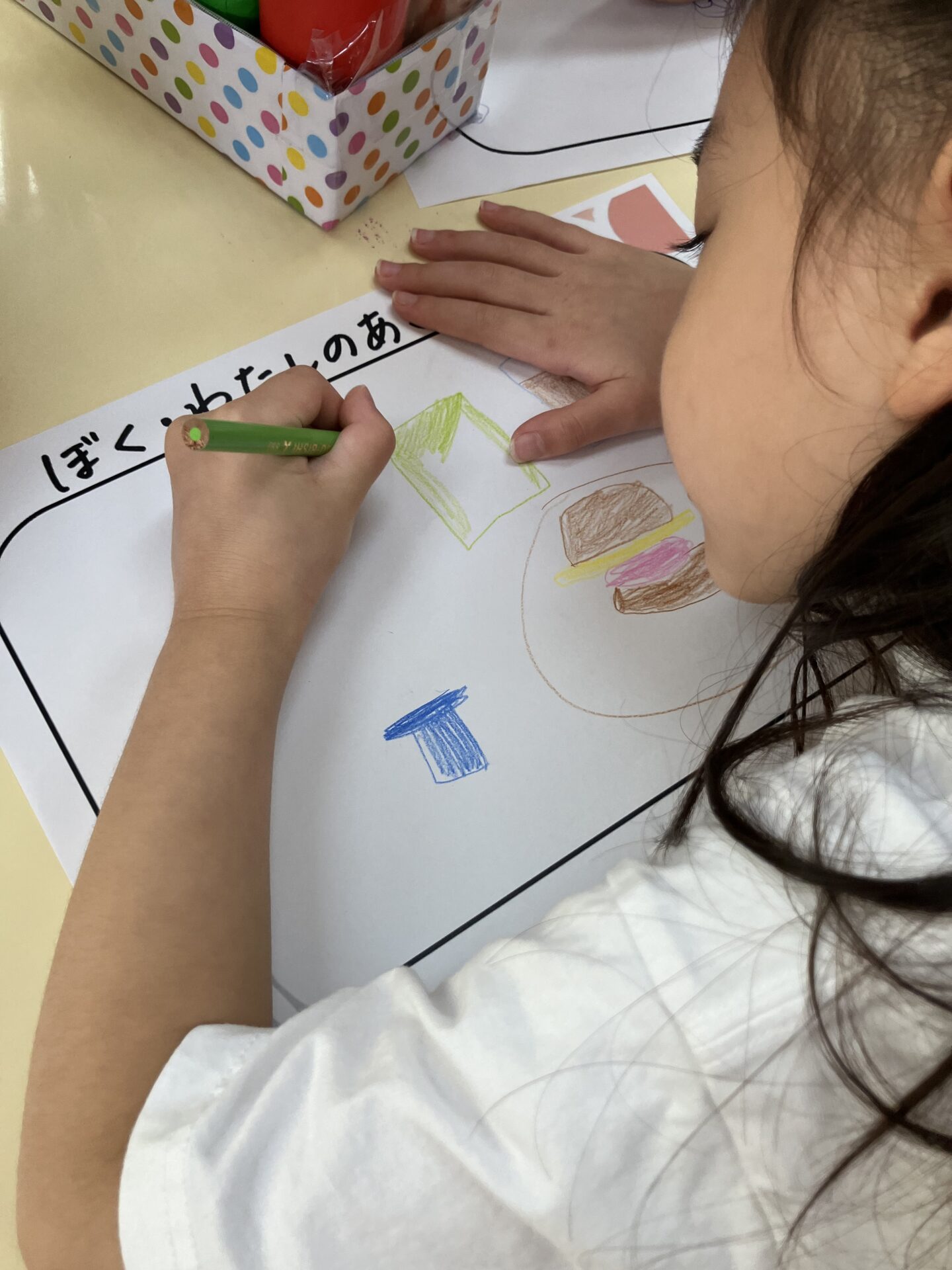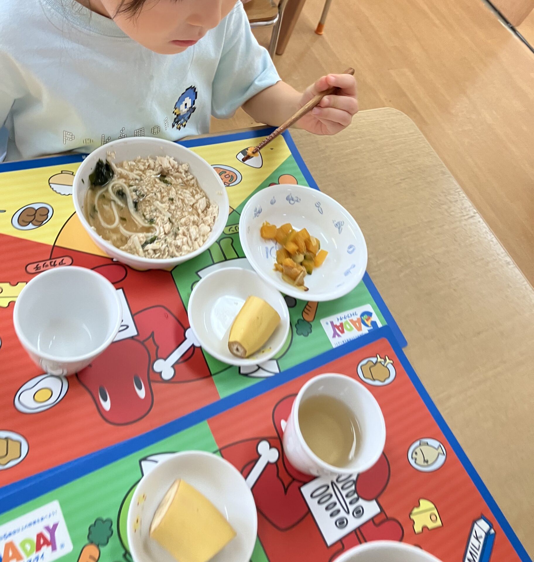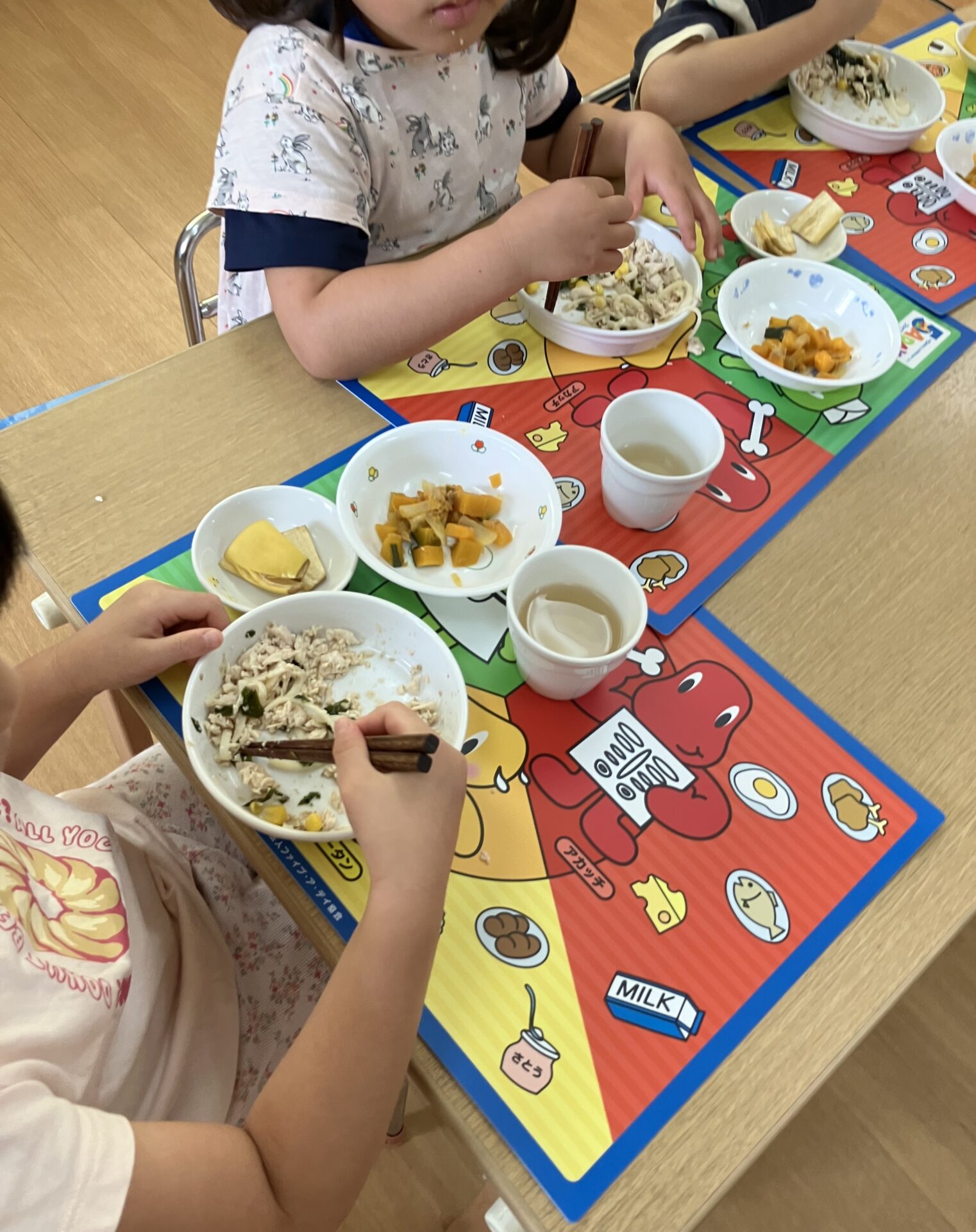 今日の野菜は何かな?黄色チームに入るのは何だろう?と、食品分けを考えつつ、バランス良くしっかり食べる事が出来ました!