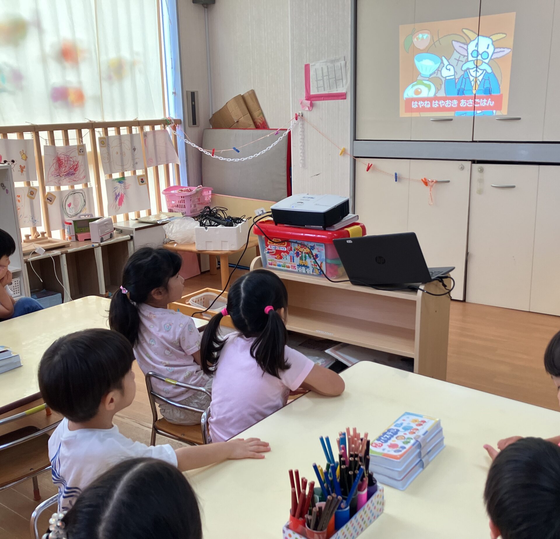 まず初めに、バランス良く食べる事や朝ごはんの大切さについて、DVDを見てお勉強しました。