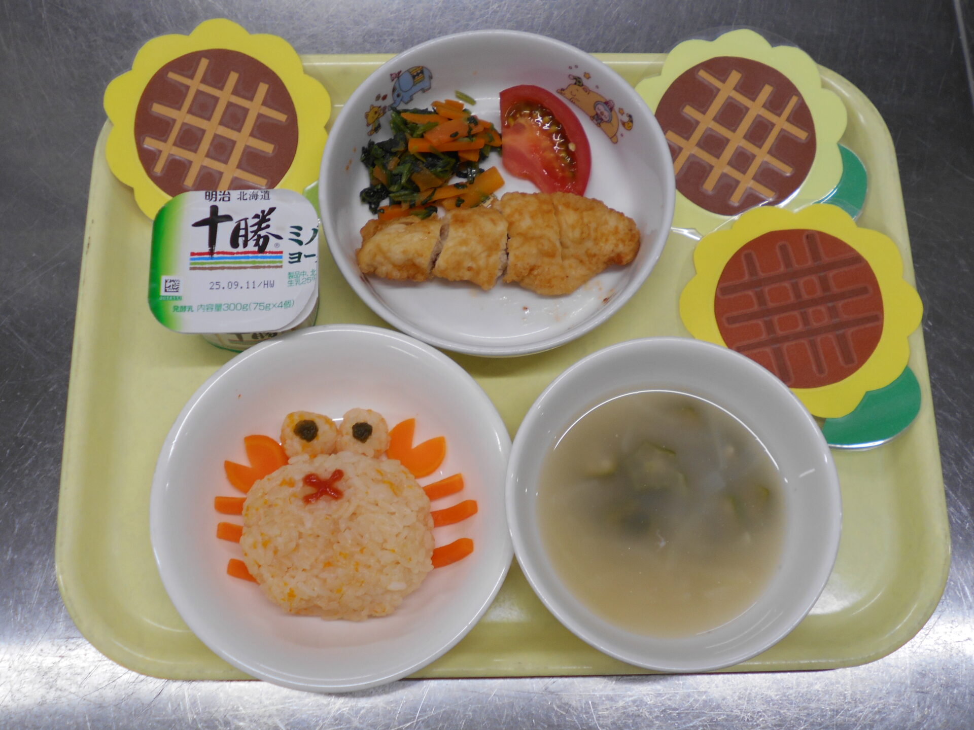 給食の前から「今日の給食カニさんご飯でしょ!」と楽しみにしていて、「カニさんかわいい!」と喜んでいました。
