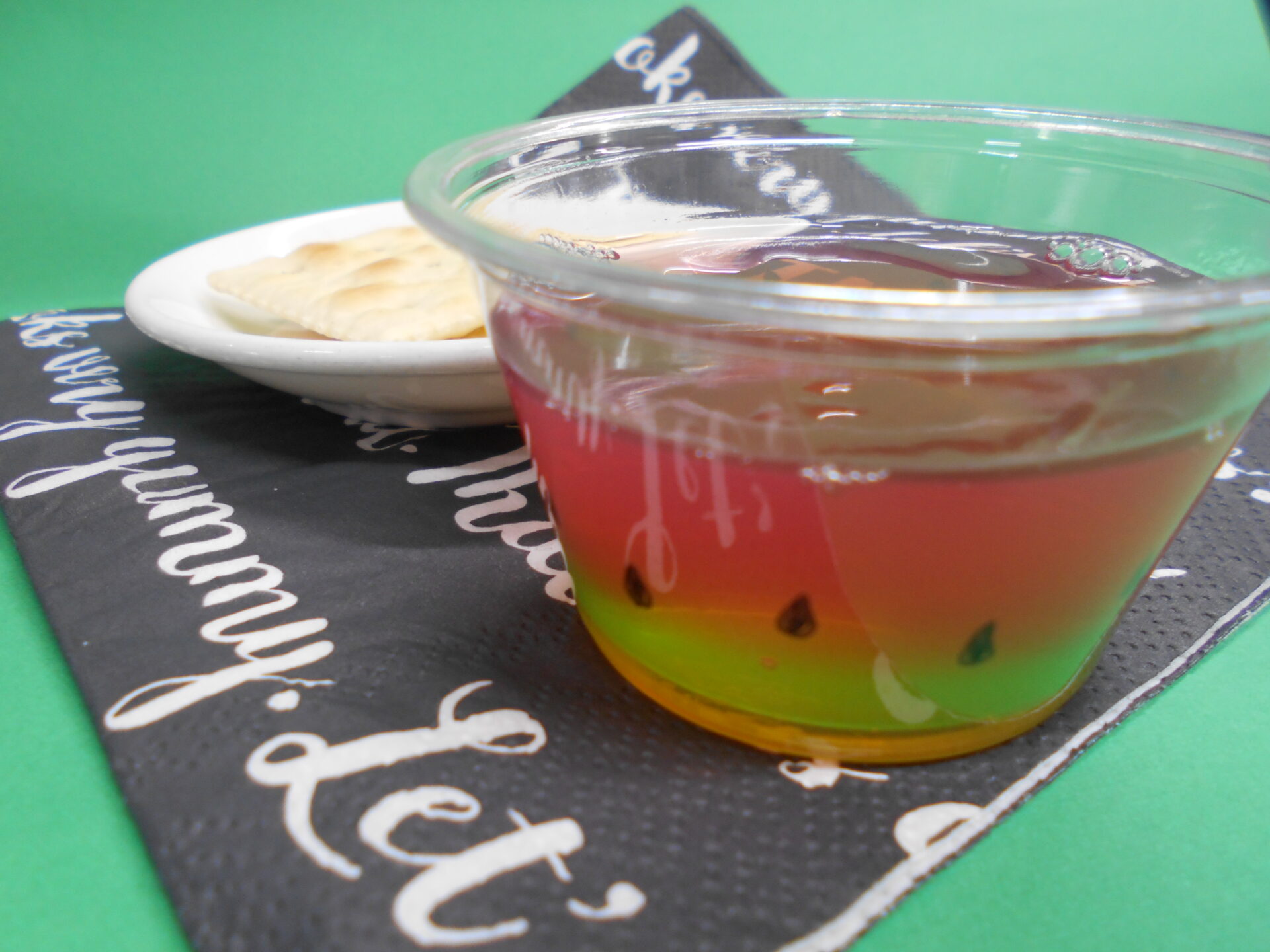 シロップを使用してすいかの皮の部分の緑色とすいかの身の部分の赤色の寒天ゼリーを作って、緑色のゼリーが固まったら赤色のゼリーを流して2層にしました。