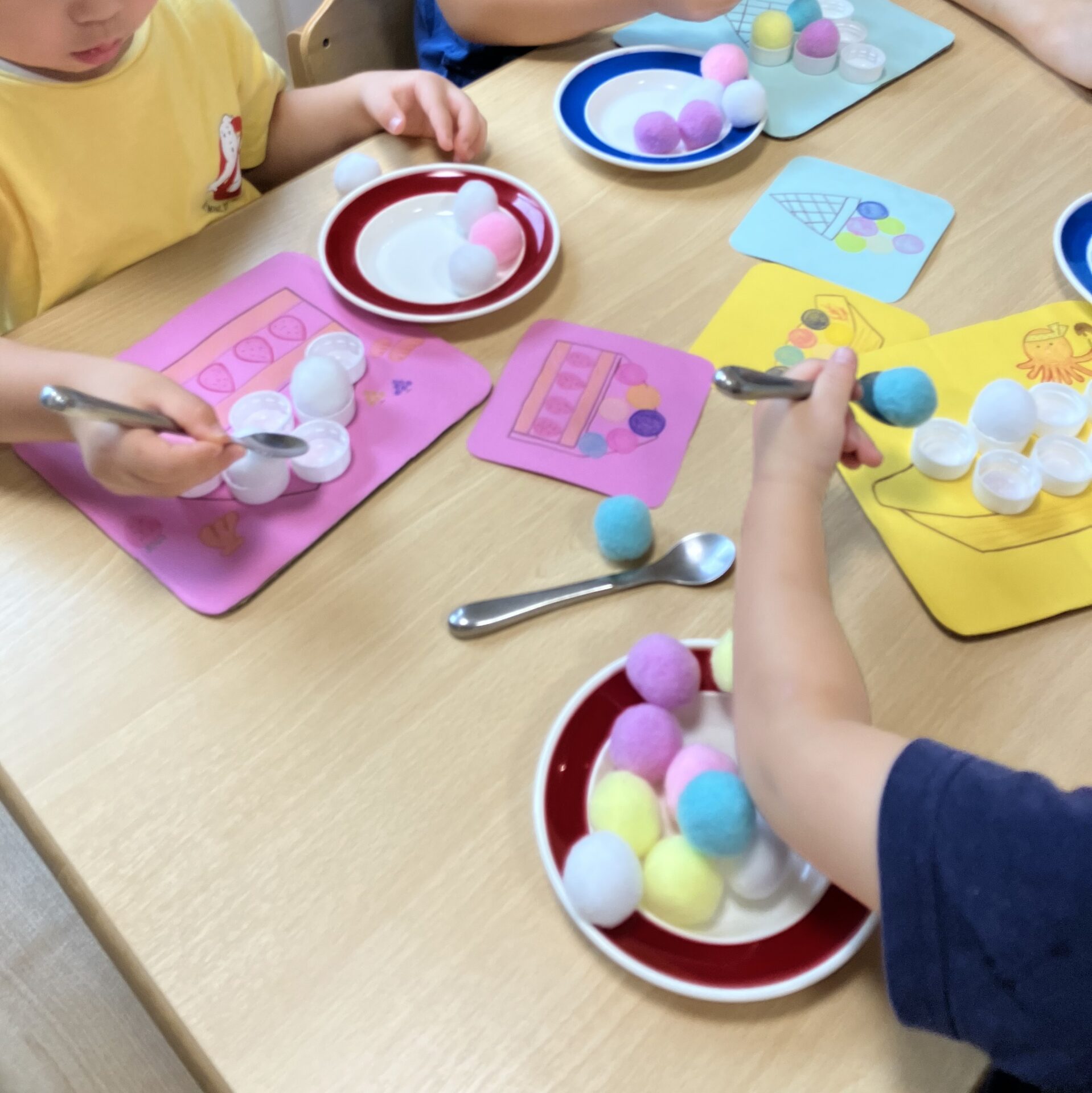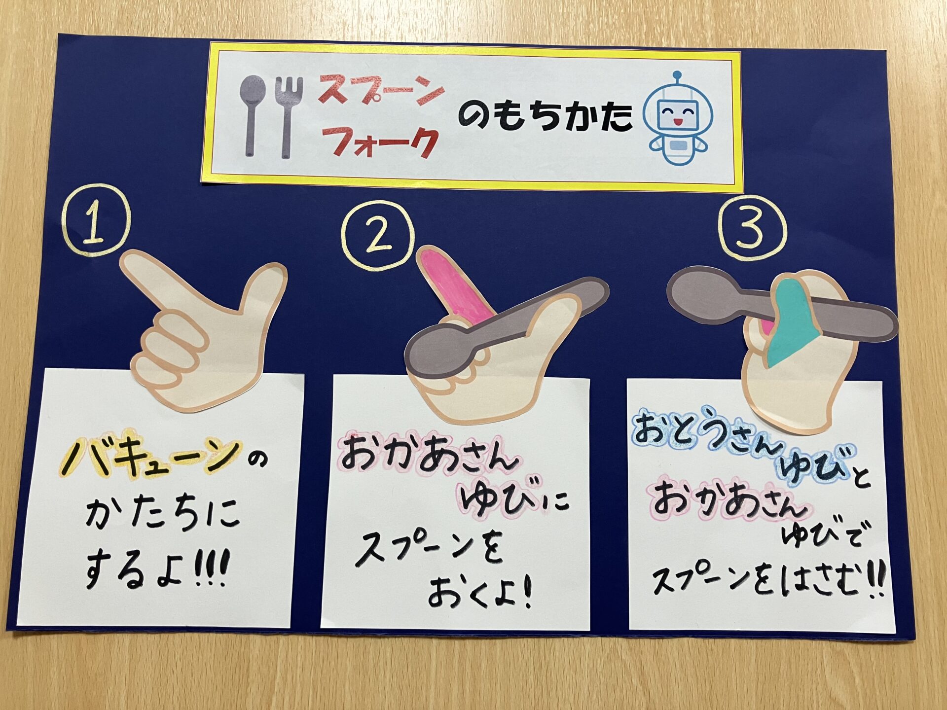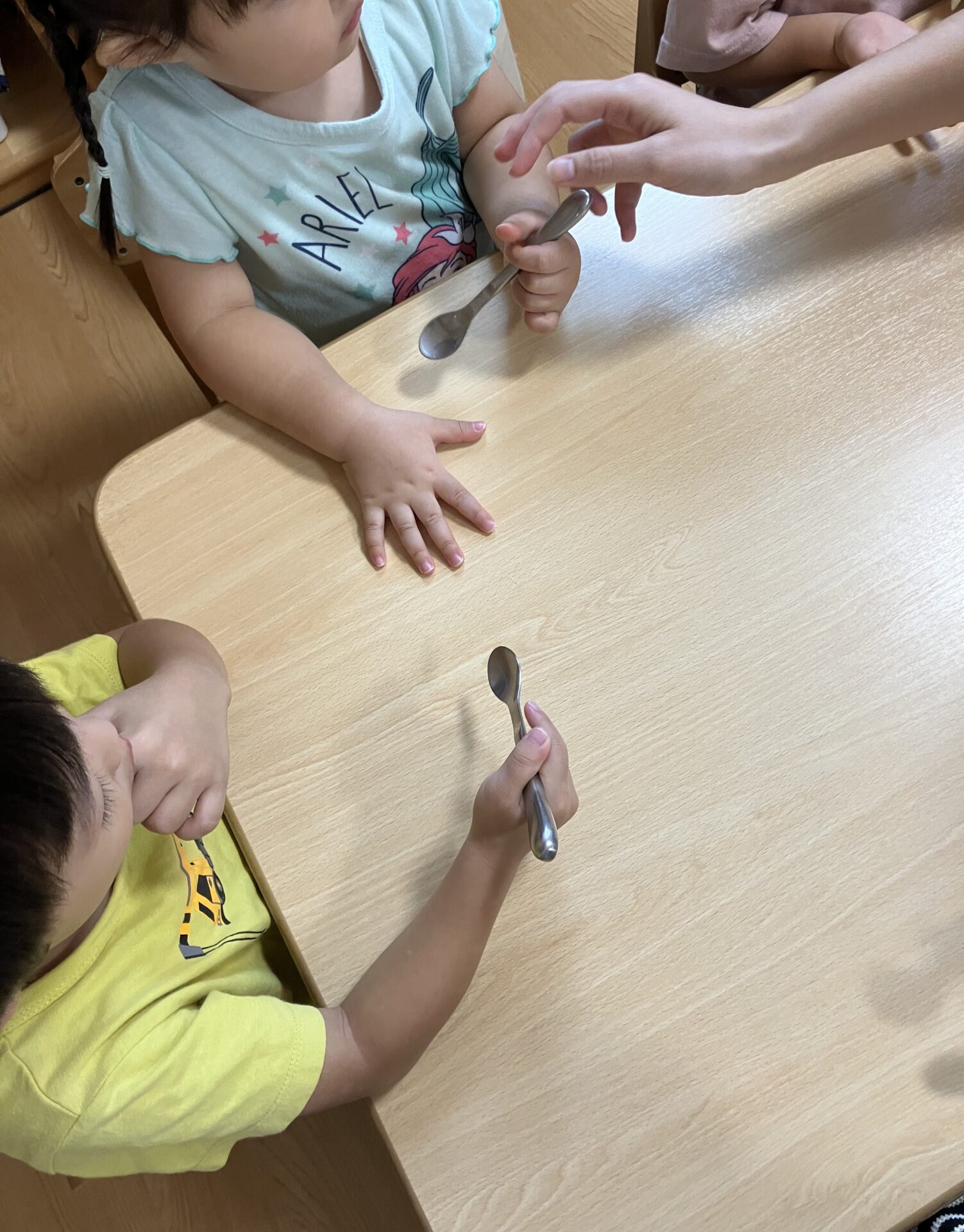 2才クラスで食具の持ち方の練習をしましたのでその様子を少しご紹介します♪