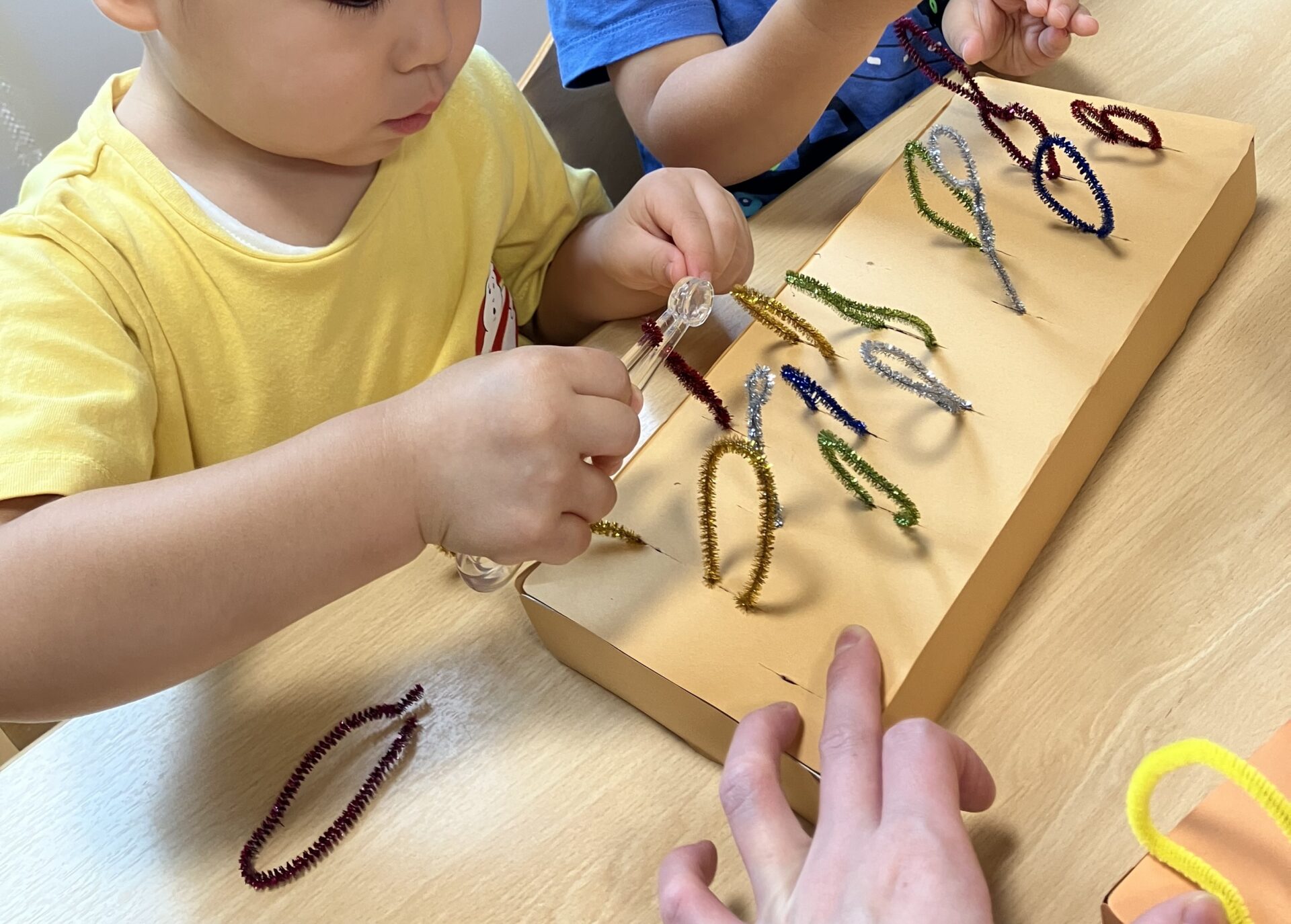 トングの持つ位置、力の入れ方などコツをつかむと黙々とモールを掴んでいました。力いっぱい掴んだ反動でスポーン!と遠くにモールが飛んでいってしまうと「かぶみたいにぬけたね♪」と思わず笑ってしまう子どもたち。