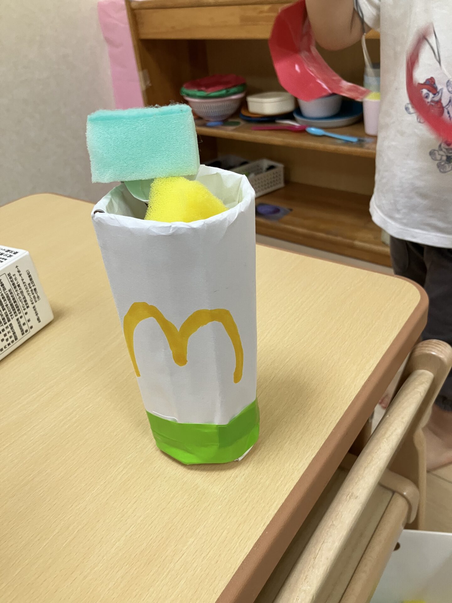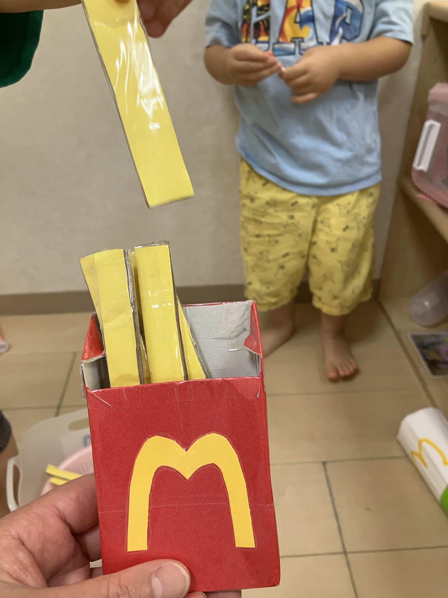 「いらっしゃいませ。ポテトはいかがですか」「シェイクもありますよ」とまるで本物の店員さんのような口調で、保育者やお友だちとやり取りを楽しんでいます。